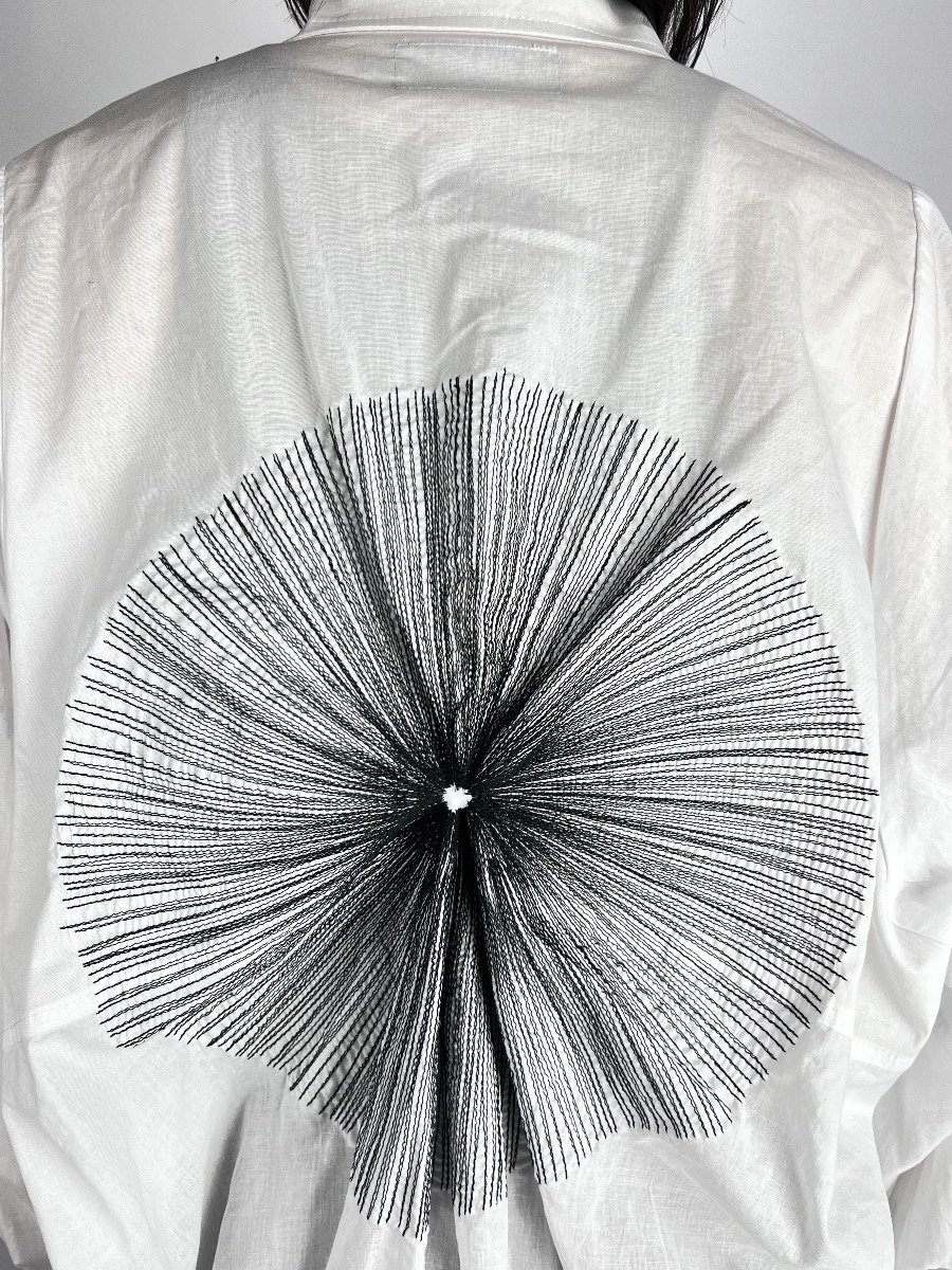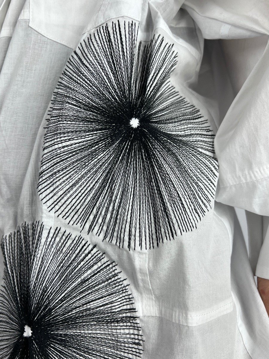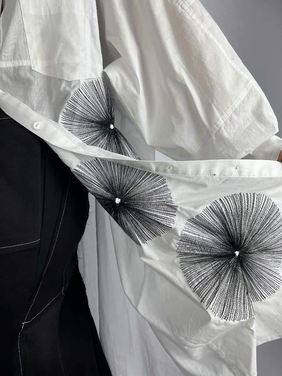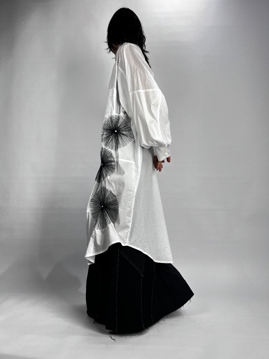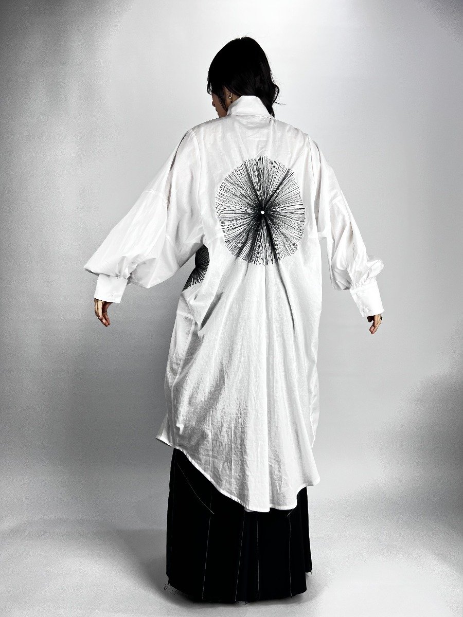 Удлинённая рубашка из натурального хлопка, с классическим воротником, пуговицами по всей длине и просторными рукавами, создающими эффектный силует. Изюминкой модели являются семь изящных вышитых кругов, напоминающих лунные диски.