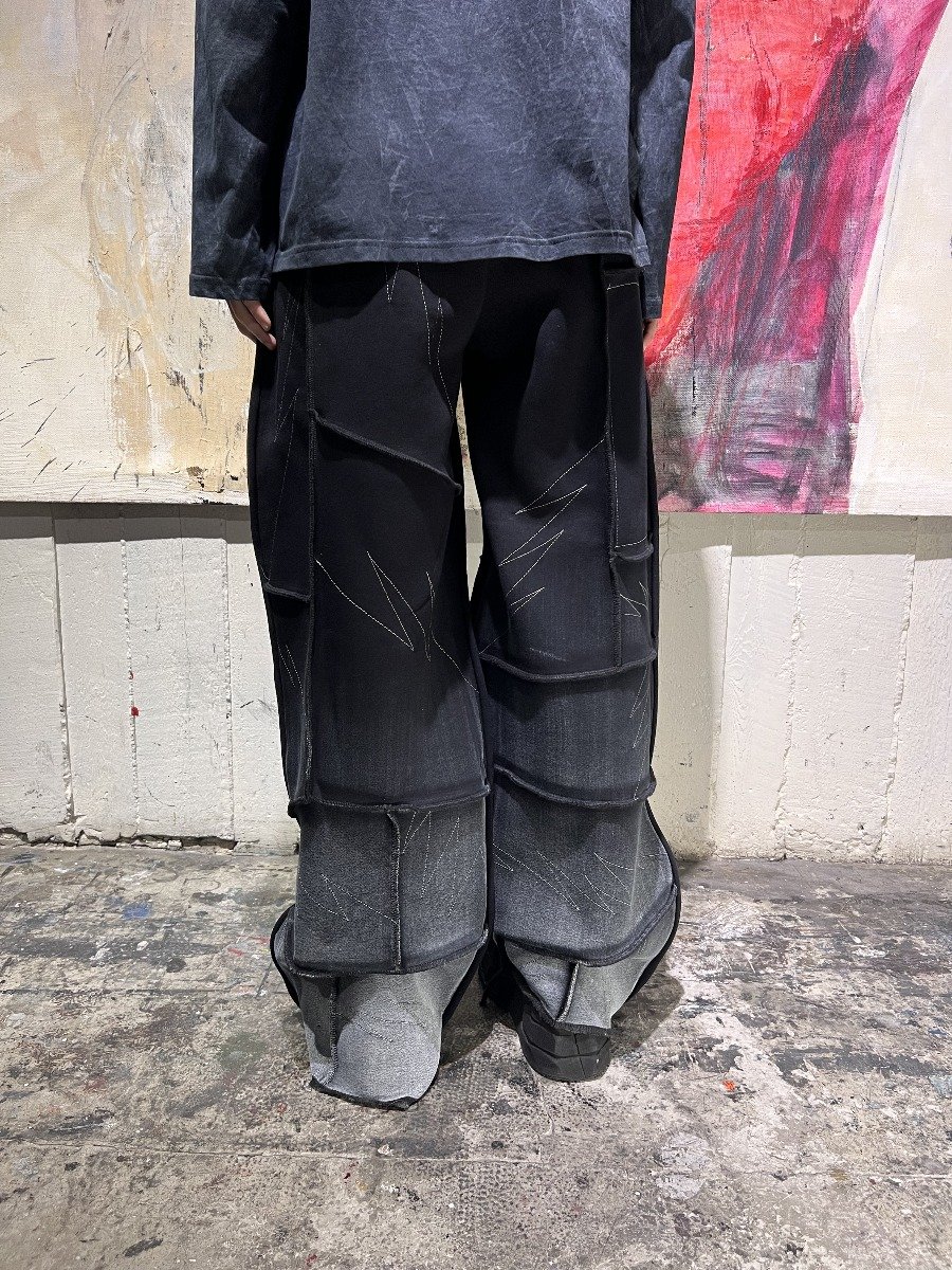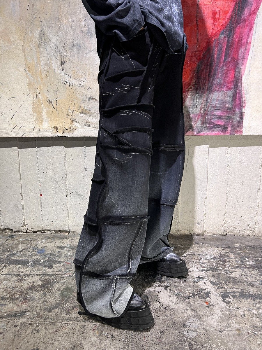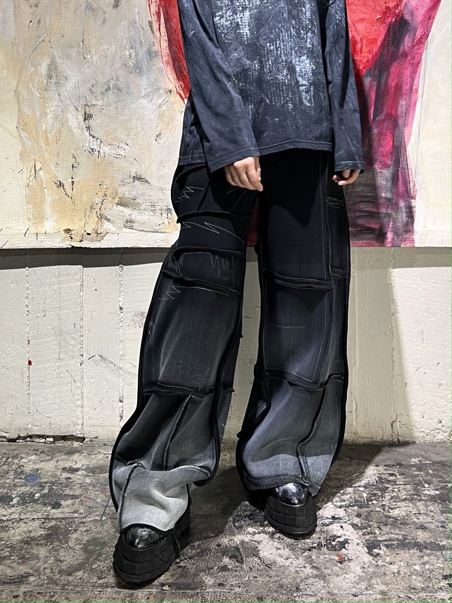 Брюки из теплого футера, сшиты из кусочков и обработаны строчками, с градиентным принтом.