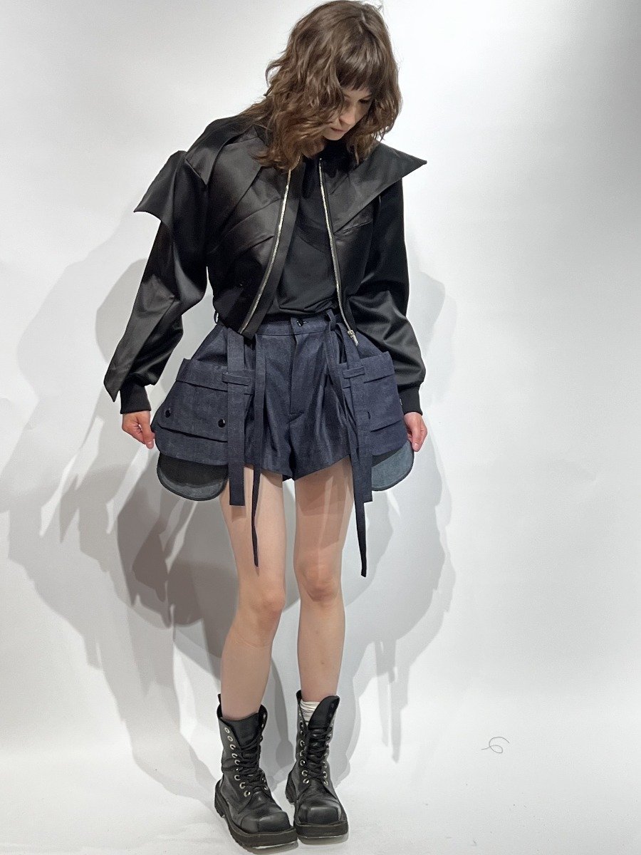 Шорты выполнены из плотного денима глубокого индиго оттенка. Их уникальность подчеркивается множеством функциональных деталей: объемные накладные карманы с клапанами и декоративными пуговицами создают эффект многослойности и добавляют изделию архитектурный объем. Широкий пояс с завязками позволяет регулировать посадку, обеспечивая комфорт и свободу движений.