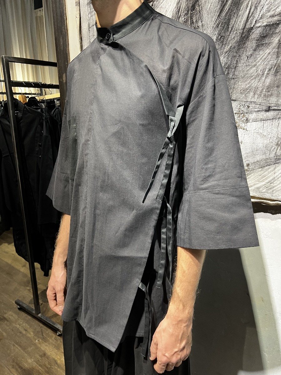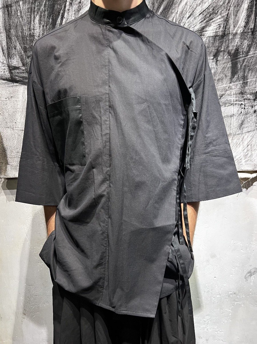 Выполнена из легкой, полупрозрачной ткани, что придает ей воздушность и легкость. Структурированный крой с асимметричными элементами и свободными завязками создает эффект непринужденной элегантности, идеально подходящий для уверенной в себе женщины, которая ценит уникальность и стиль. Высокий воротник-стойка добавляет нотку строгости и утонченности, в то время как свободные рукава и небрежные детали придают образу динамичность и современность.