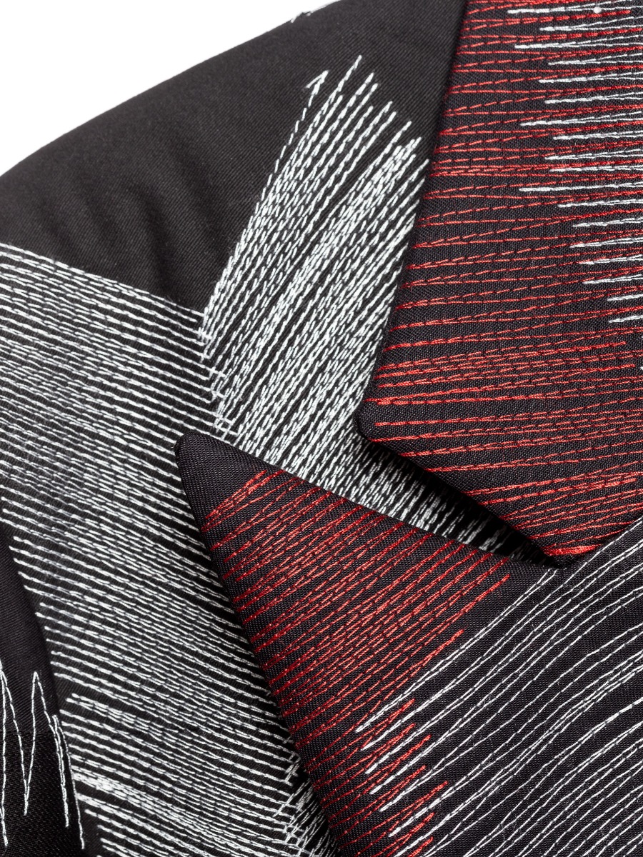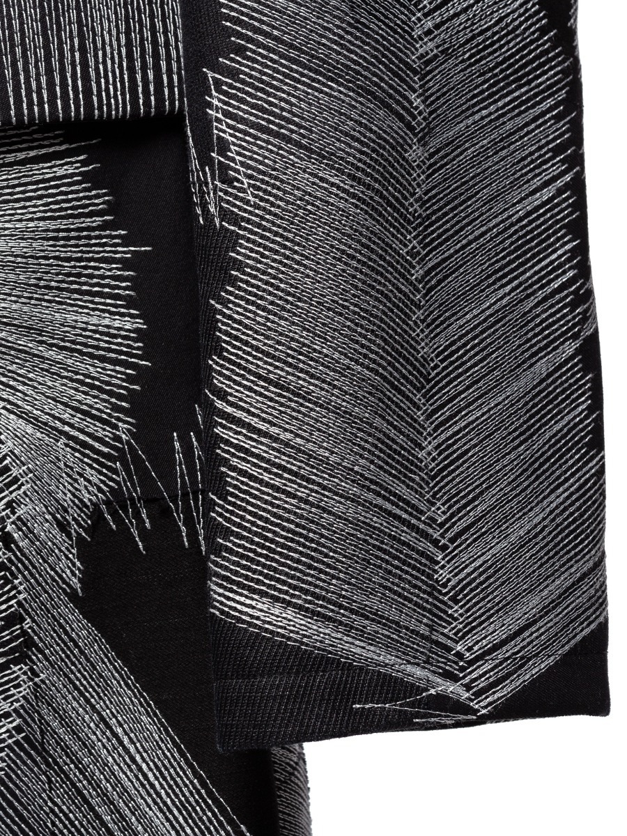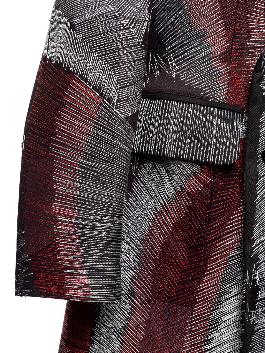 Двубортное пальто свободного силуэта с классическим воротником.Великолепная вышивка, выполненная с ювелирной точностью, создает эффект объемных текстур и динамичных узоров. Глубокие оттенки черного, серого и бордового переплетаются в абстрактном танце, создавая уникальный визуальный эффект.