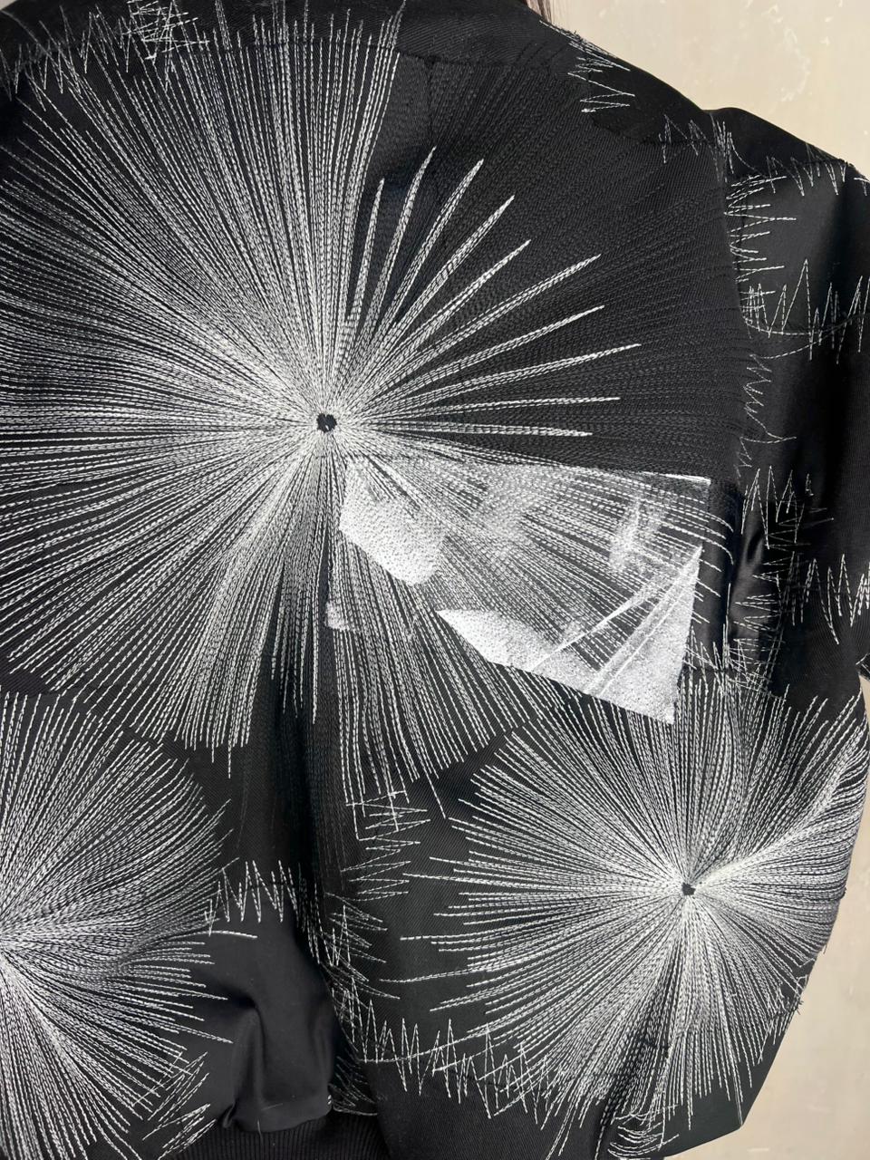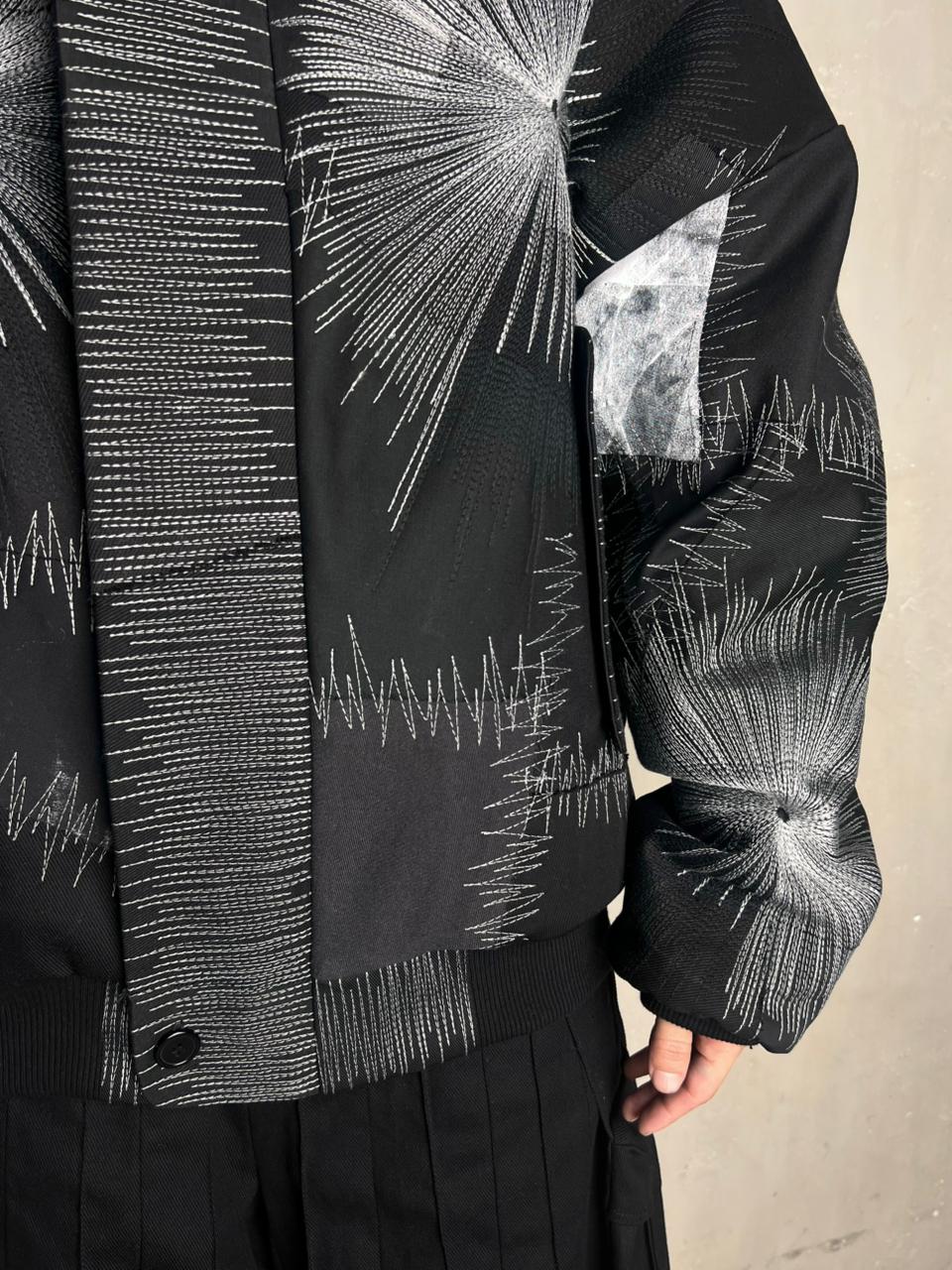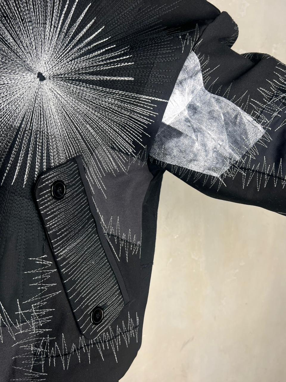 13 000 ₽ х 4 платежаБомбер соткан из лоскутов хлопка, черной джинсовой ткани, а также фрагментов рукотворных живописных картин. Каждый элемент соединён с помощью изящной вышивки, создающей уникальный визуальный ритм.