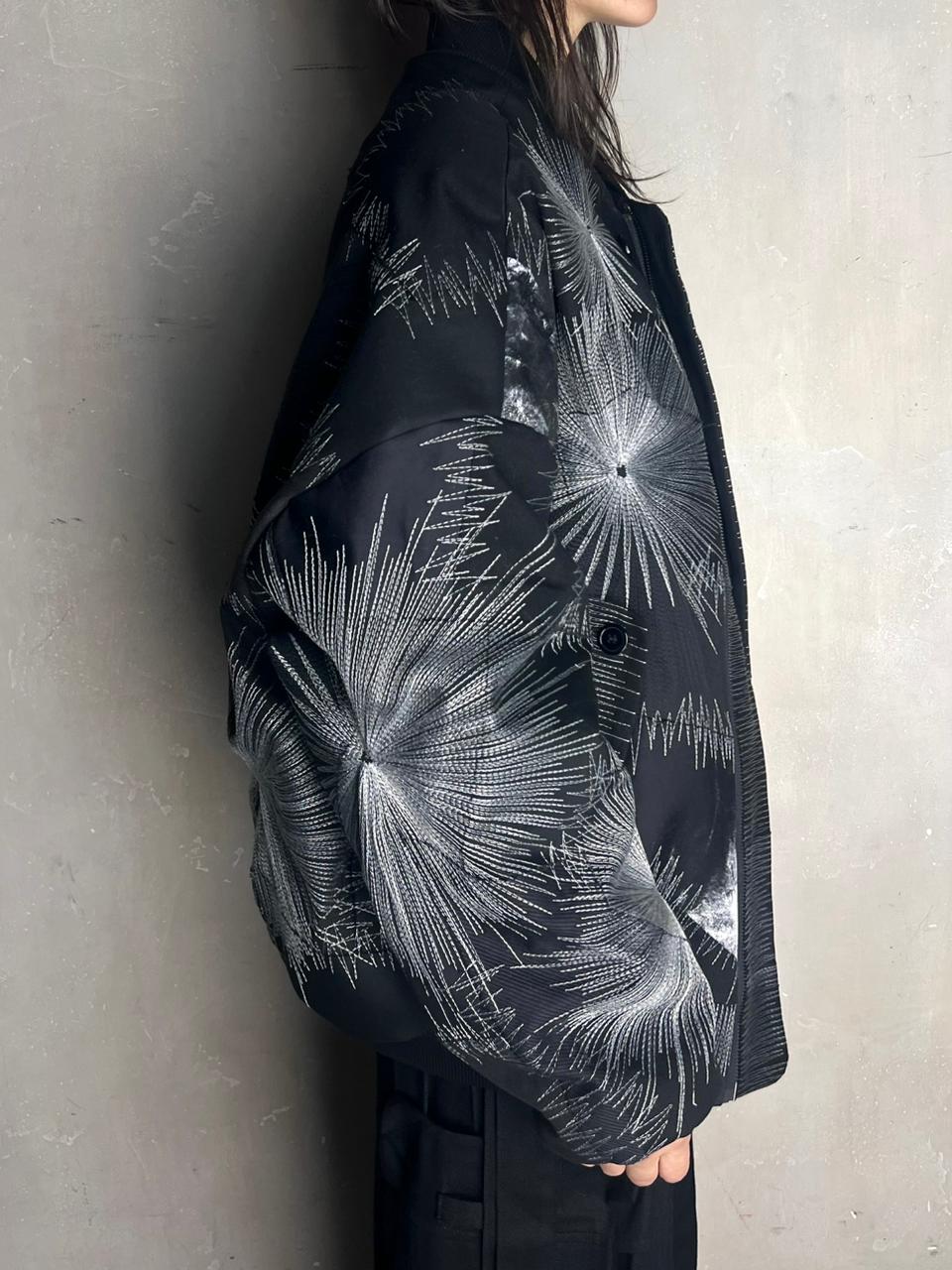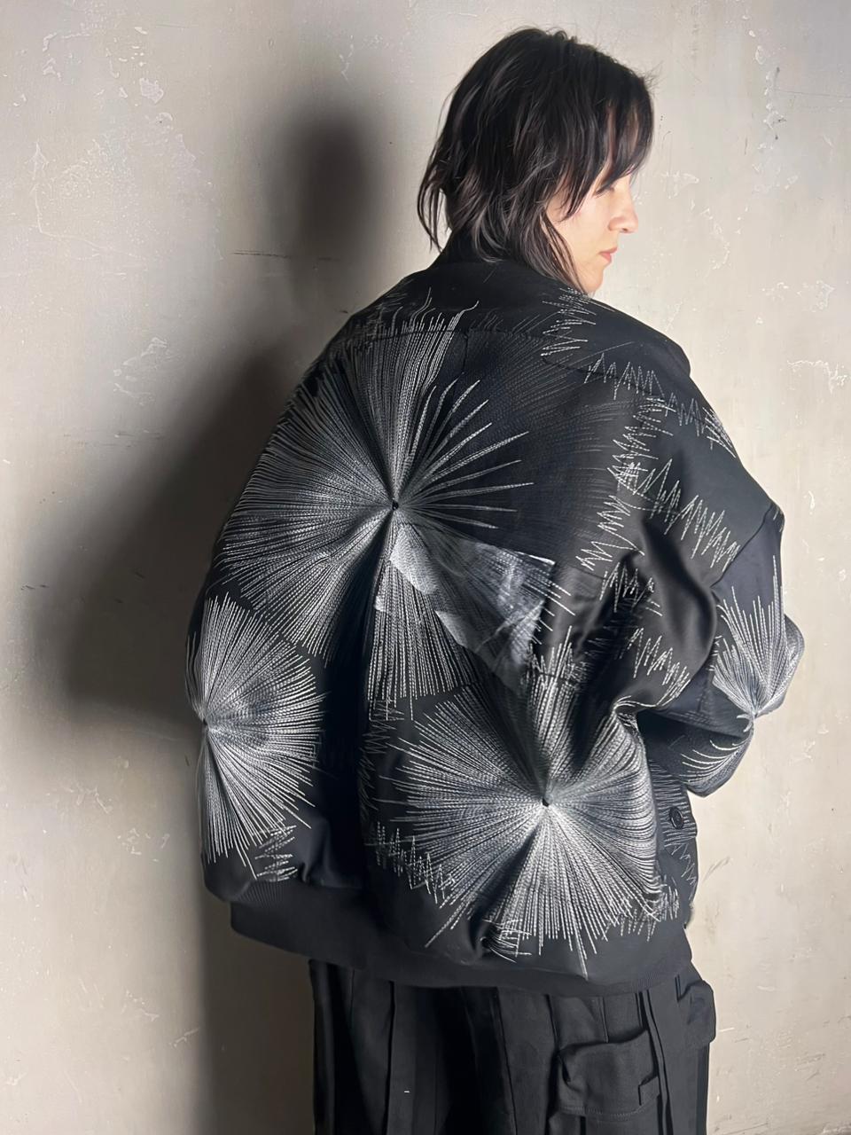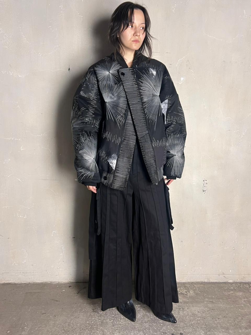 13 000 ₽ х 4 платежаБомбер соткан из лоскутов хлопка, черной джинсовой ткани, а также фрагментов рукотворных живописных картин. Каждый элемент соединён с помощью изящной вышивки, создающей уникальный визуальный ритм.