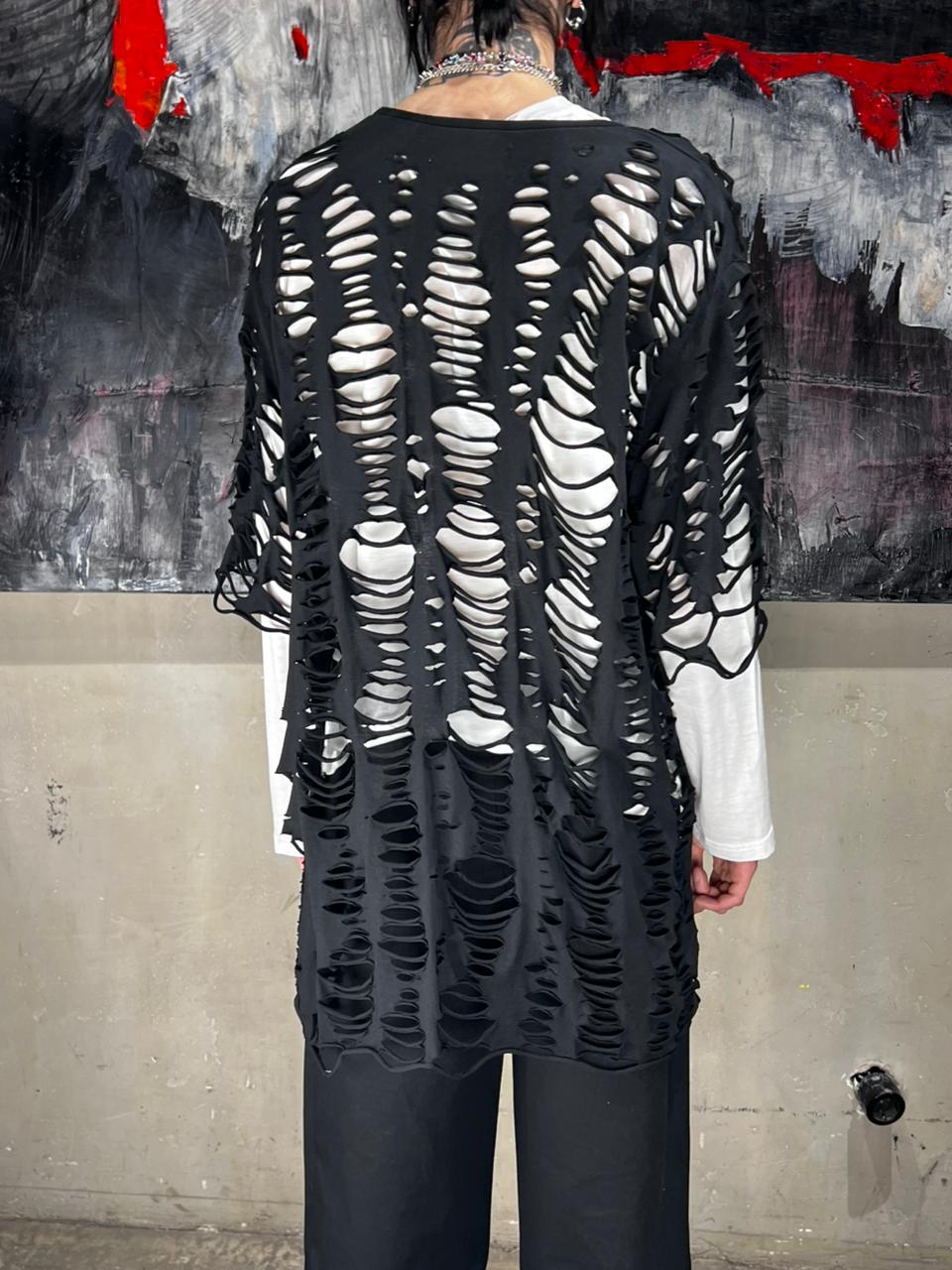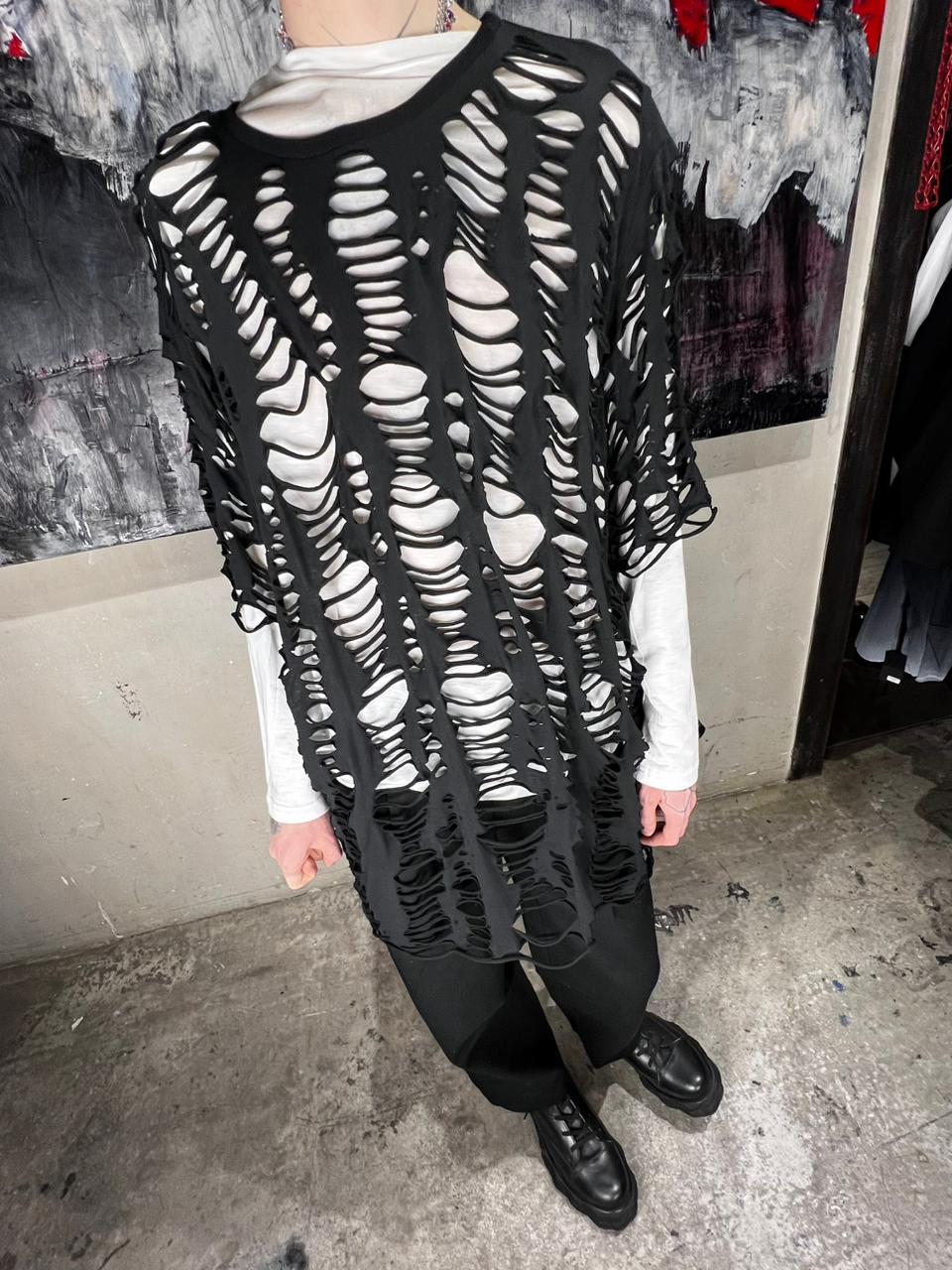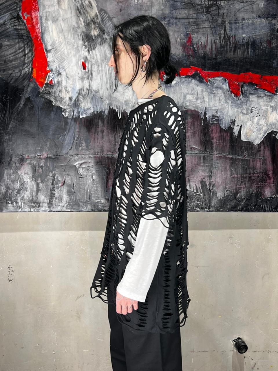 Особенность этих принтов — взаимодействие разных типов одежды: на футболке проявляется контур рубашки, на рубашке — складки металла. Краска выходит за пределы привычной формы, образуя подтеки, линии, непредсказуемые графические рельефы, которые оживают только на ткани.