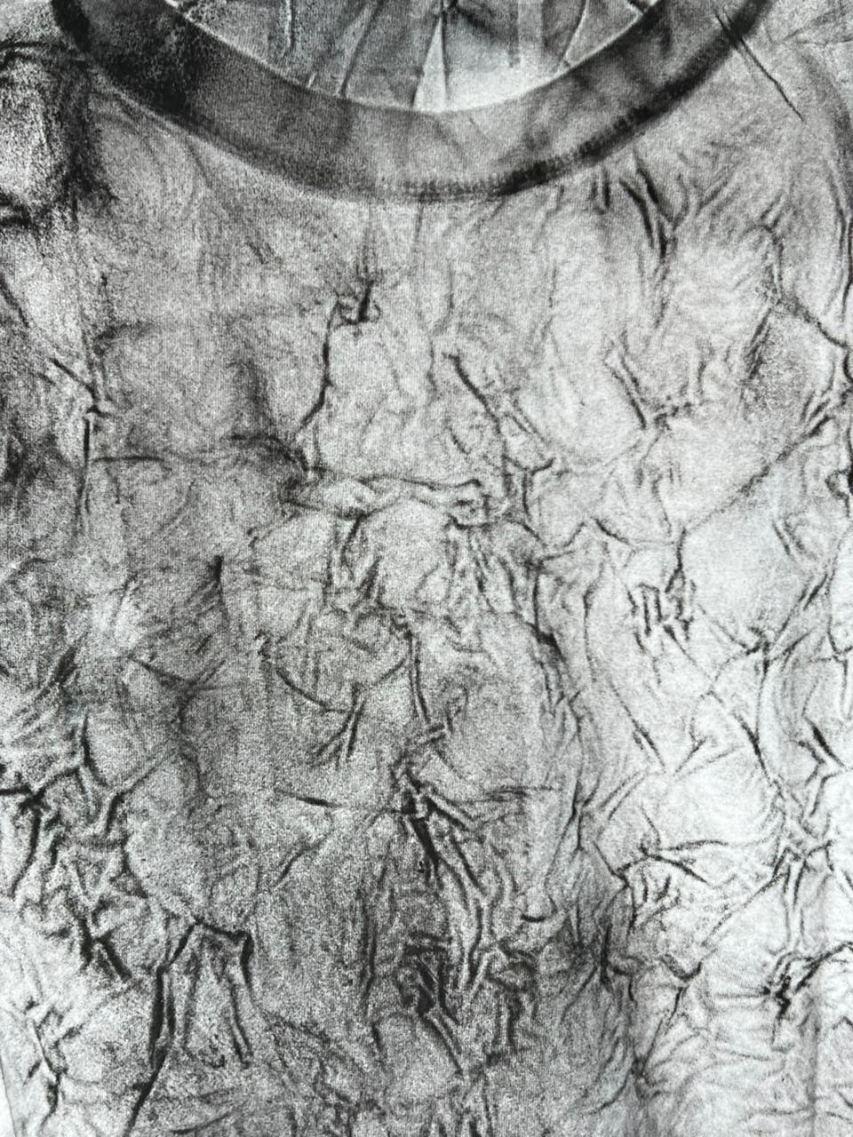 Особенность этих принтов — взаимодействие разных типов одежды: на футболке проявляется контур рубашки, на рубашке — складки металла. Краска выходит за пределы привычной формы, образуя подтеки, линии, непредсказуемые графические рельефы, которые оживают только на ткани.