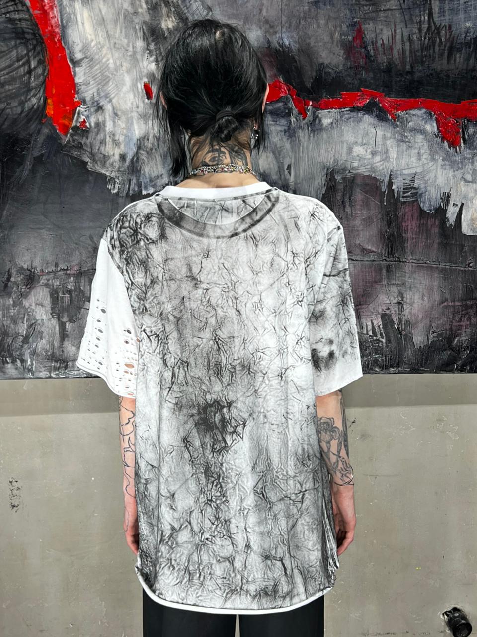 Футболка с монохромным принтом на белой основе с необработанным нижним краем. Модель имеет оверсайз-силуэт и свободную посадку. Воротник и левый рукав белого цвета, рукав декорирован художественными разрезами.