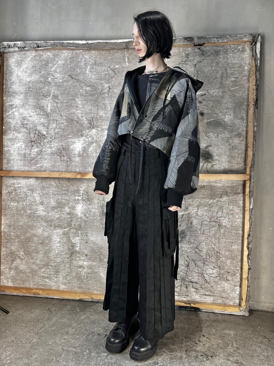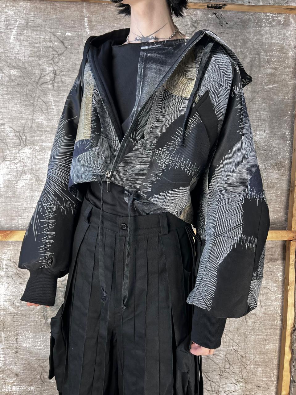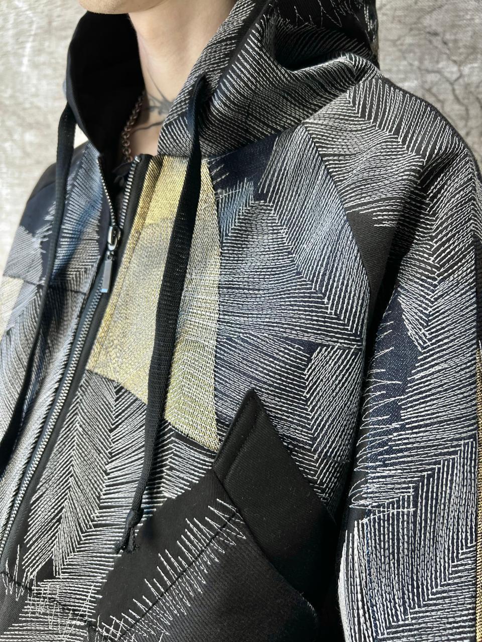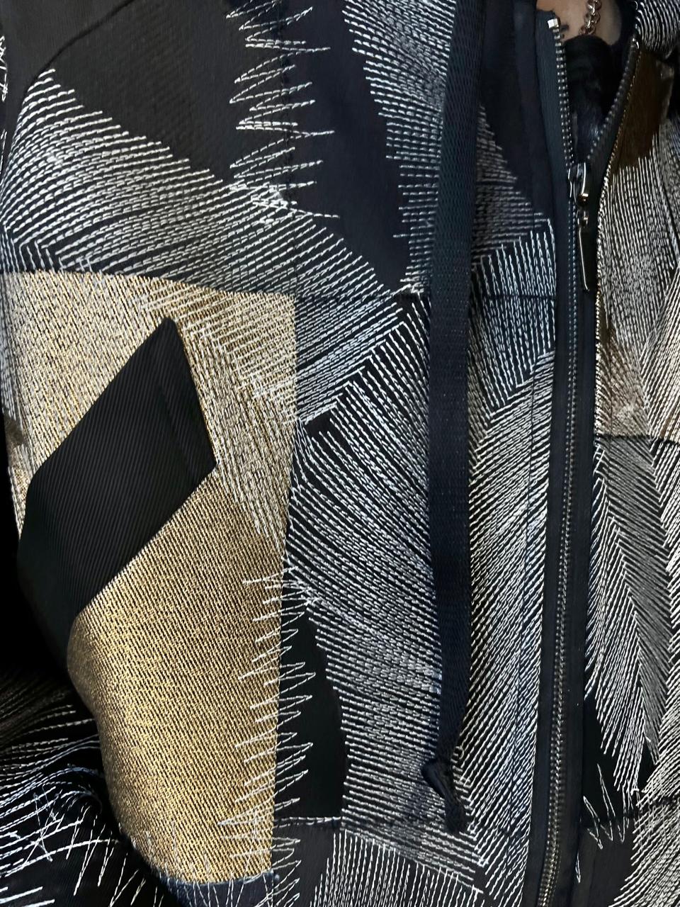 Куртка-кроп собрана из лоскутков джинсы и золотистых вставок. Каждый элемент соединён с помощью изящной вышивки, которая формирует динамичный рисунок. Рукава длинные, с манжетами на резинке. Центральная часть застегивается на молнию, есть боковые карманы.