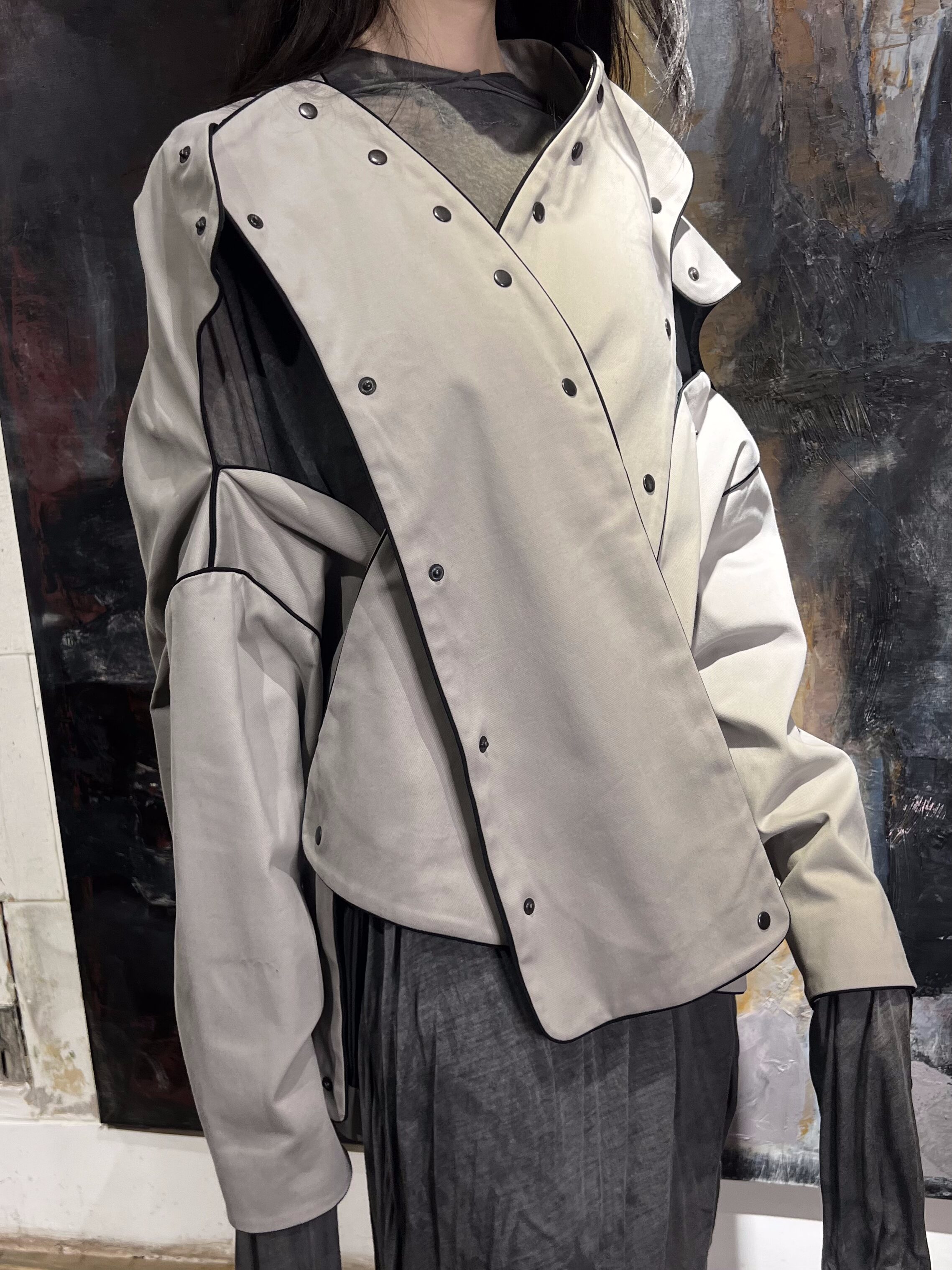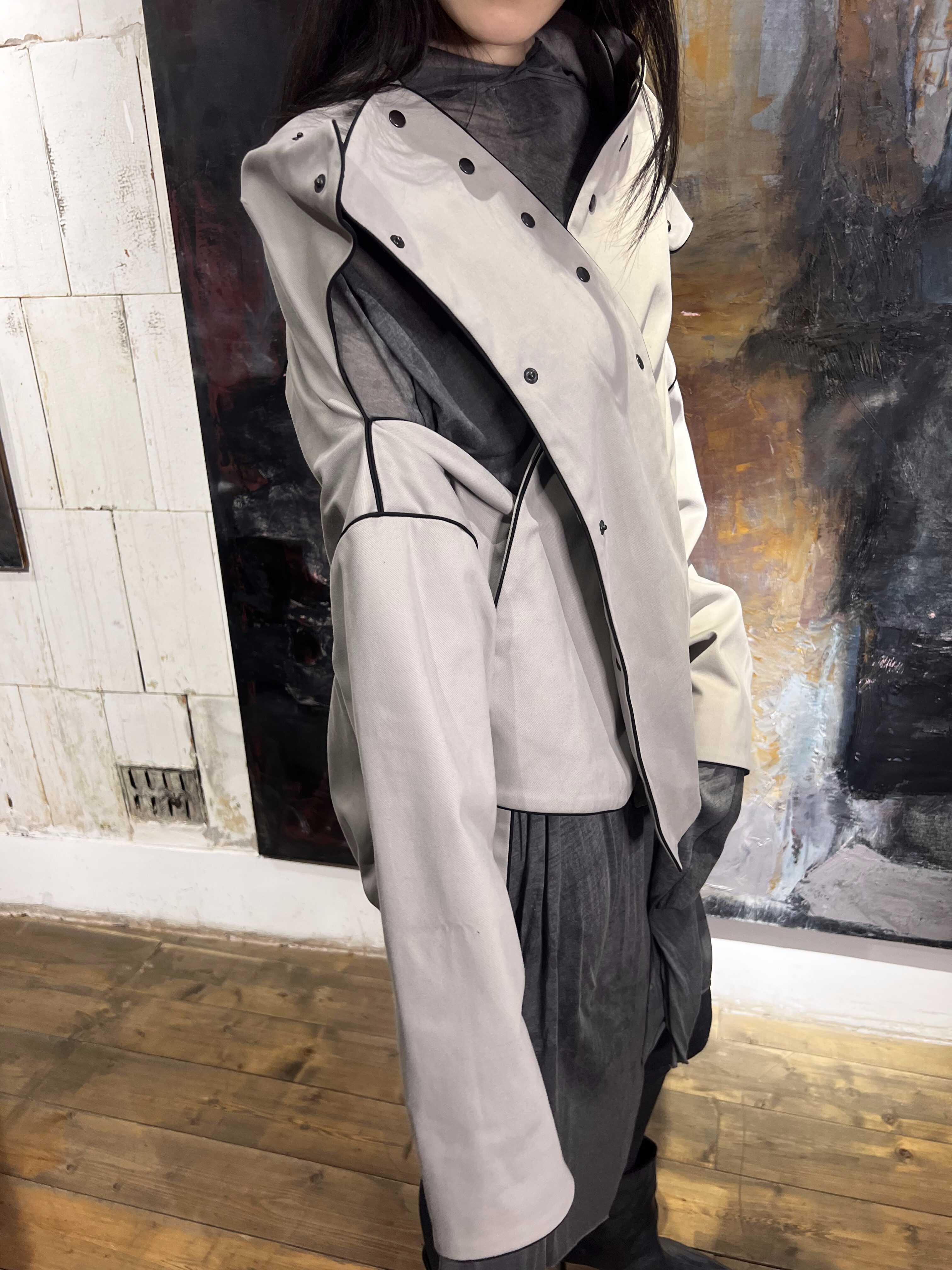 Куртка «Лабиринт» — это вещь, построенная из деталей, где каждая линия имеет значение. Цельный силуэт здесь собирается постепенно: элементы соединяются между собой с помощью кнопок, формируя сложную, но выверенную конструкцию.
