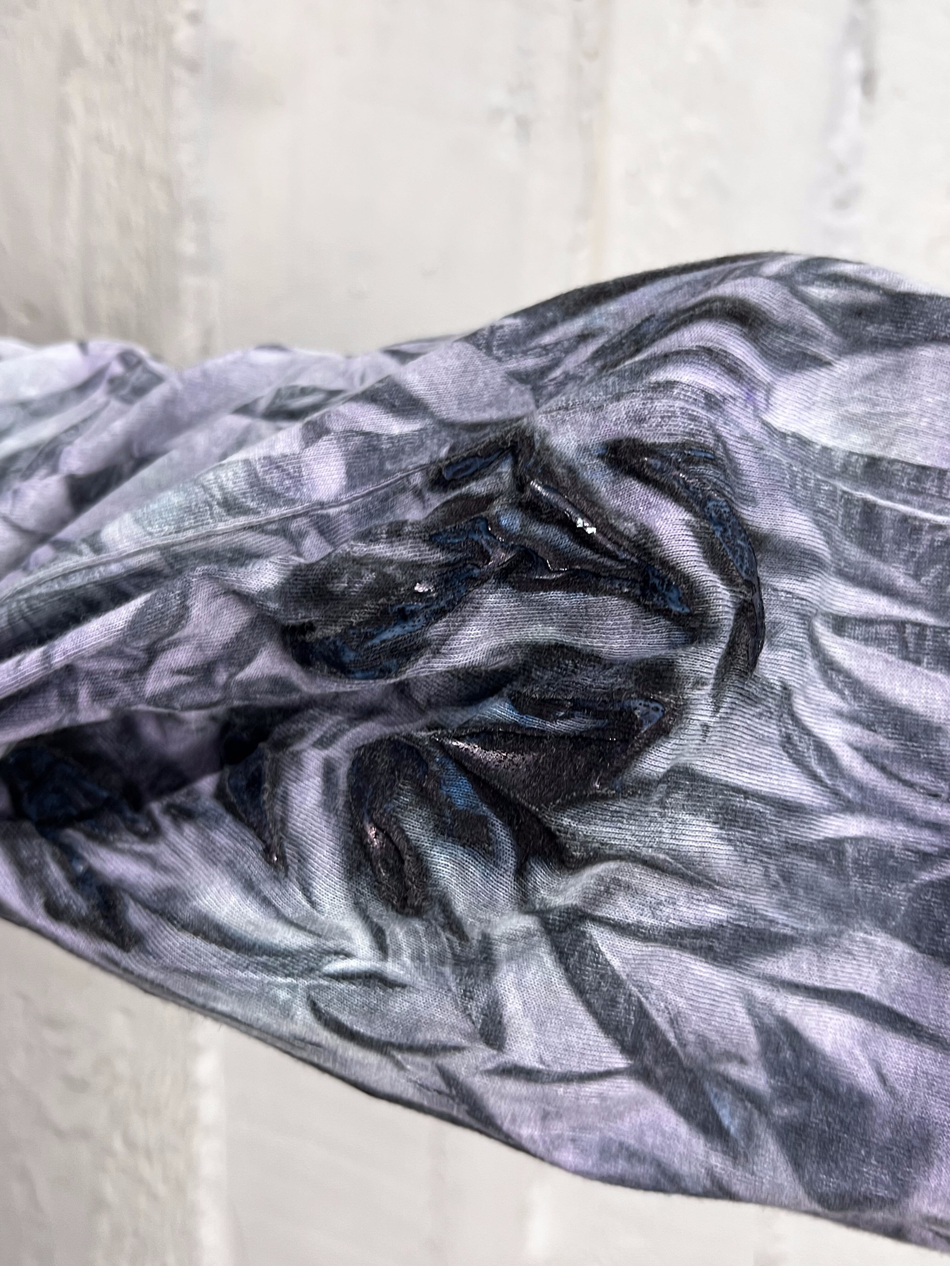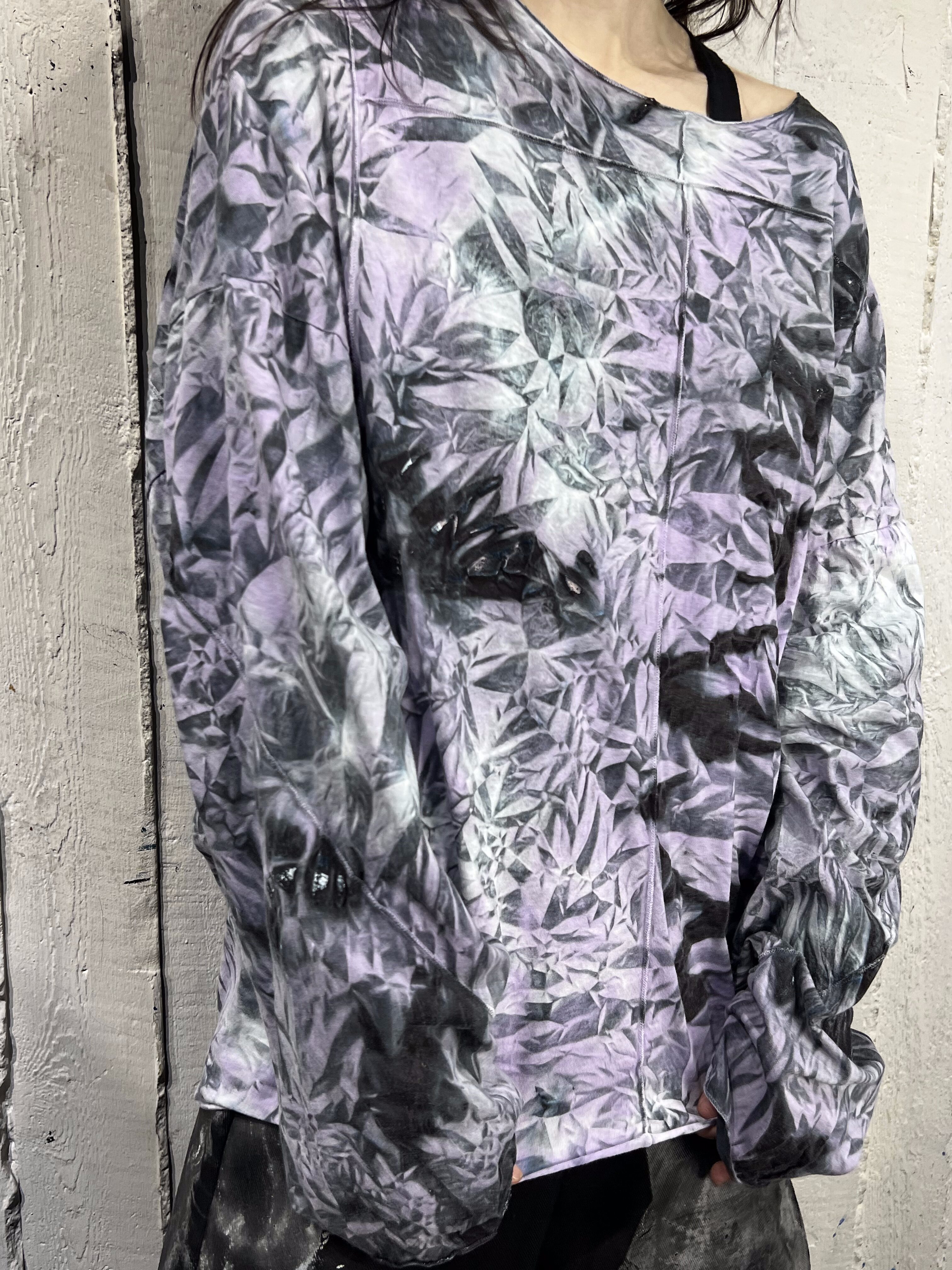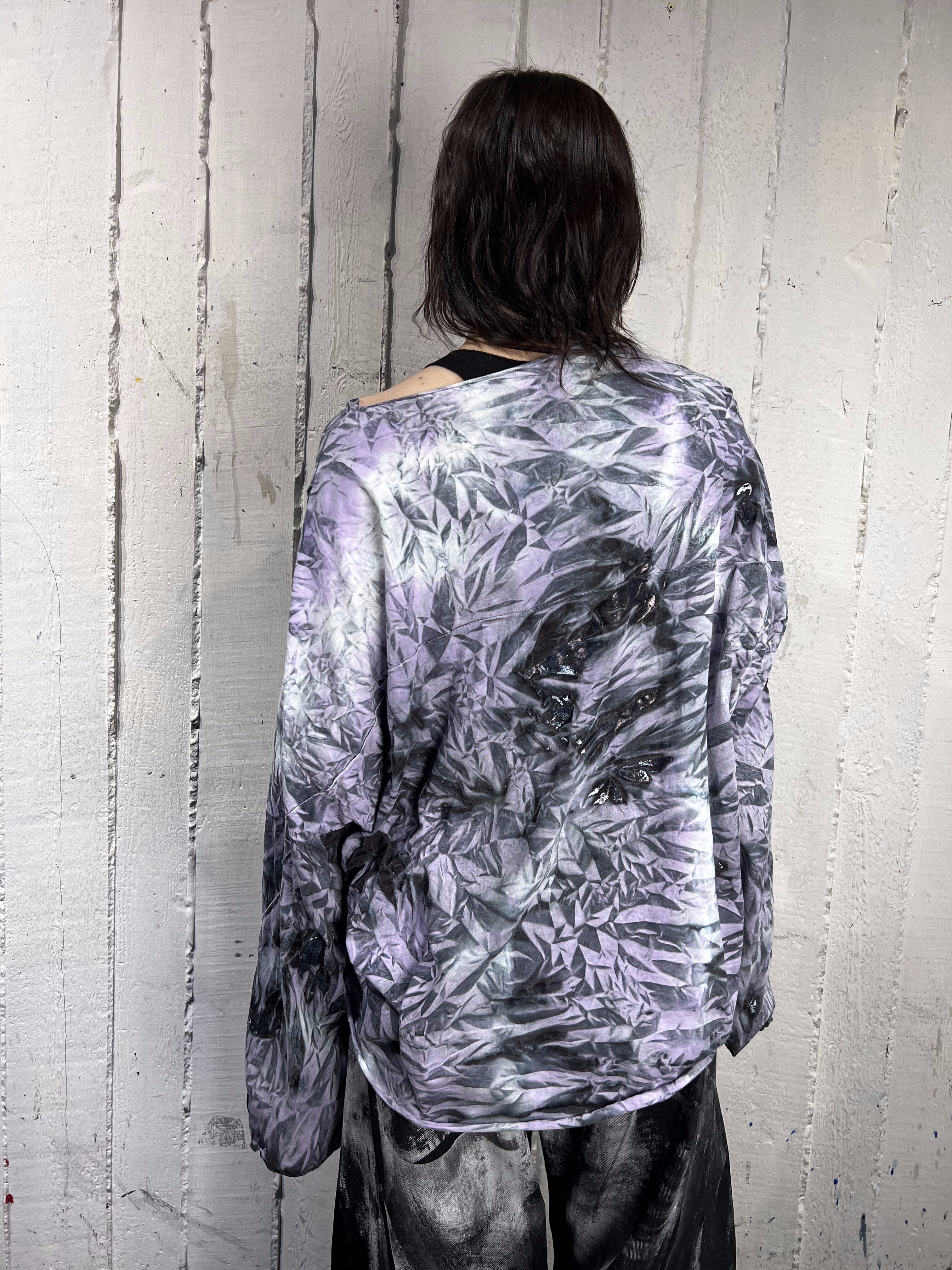 Ткань окрашена вручную с использованием особой техники, благодаря которой на поверхности появляется сложный, многослойный рисунок. Принт напоминает осколки стекла или витраж, где оттенки переплетаются между собой и создают эффект глубины и света. Свободный силуэт, длинные рукава и художественный принт делают его не просто вещью, а носимым арт-объектом.