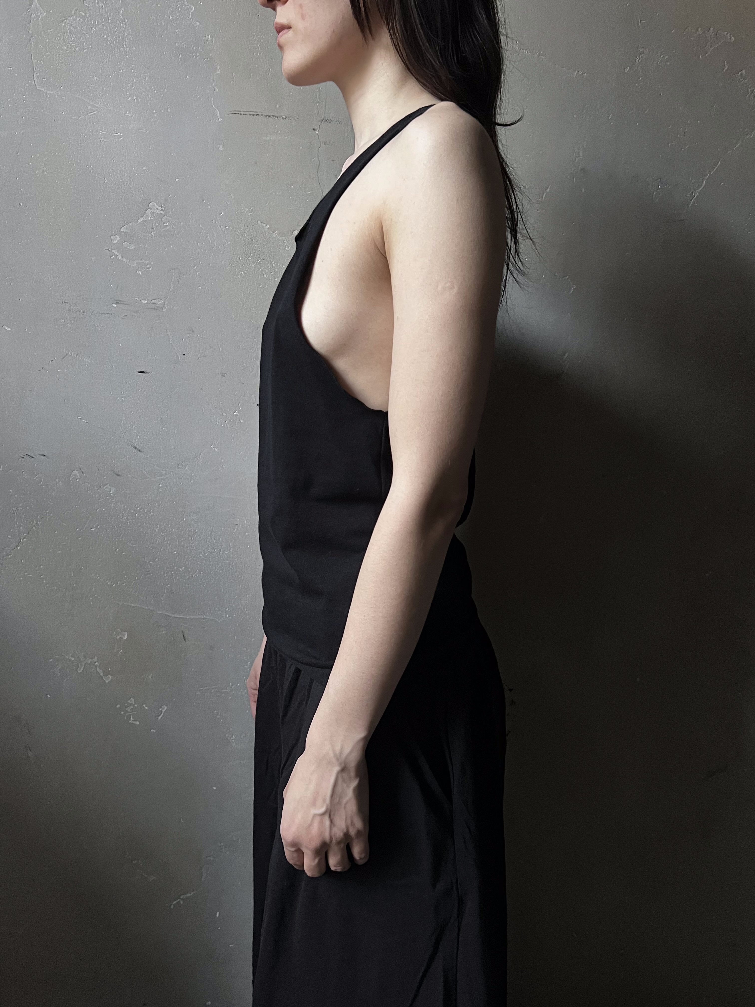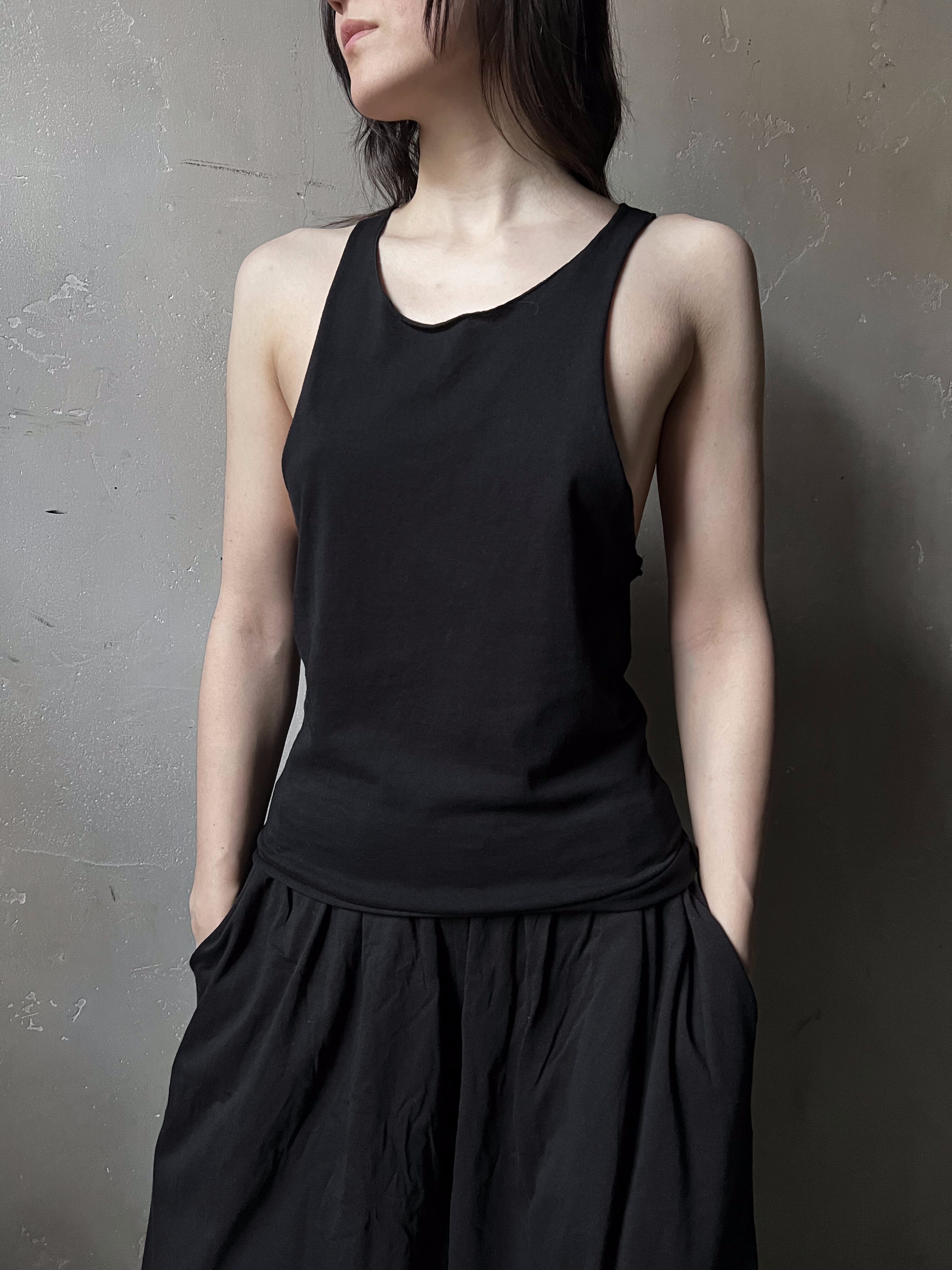 Майка из коллекции Raw Sculpture — это базовая форма, доведённая до точности. Минималистичный крой с широким вырезом рукава, тонкими лямками и перекрещенной спинкой создаёт чистый силуэт.