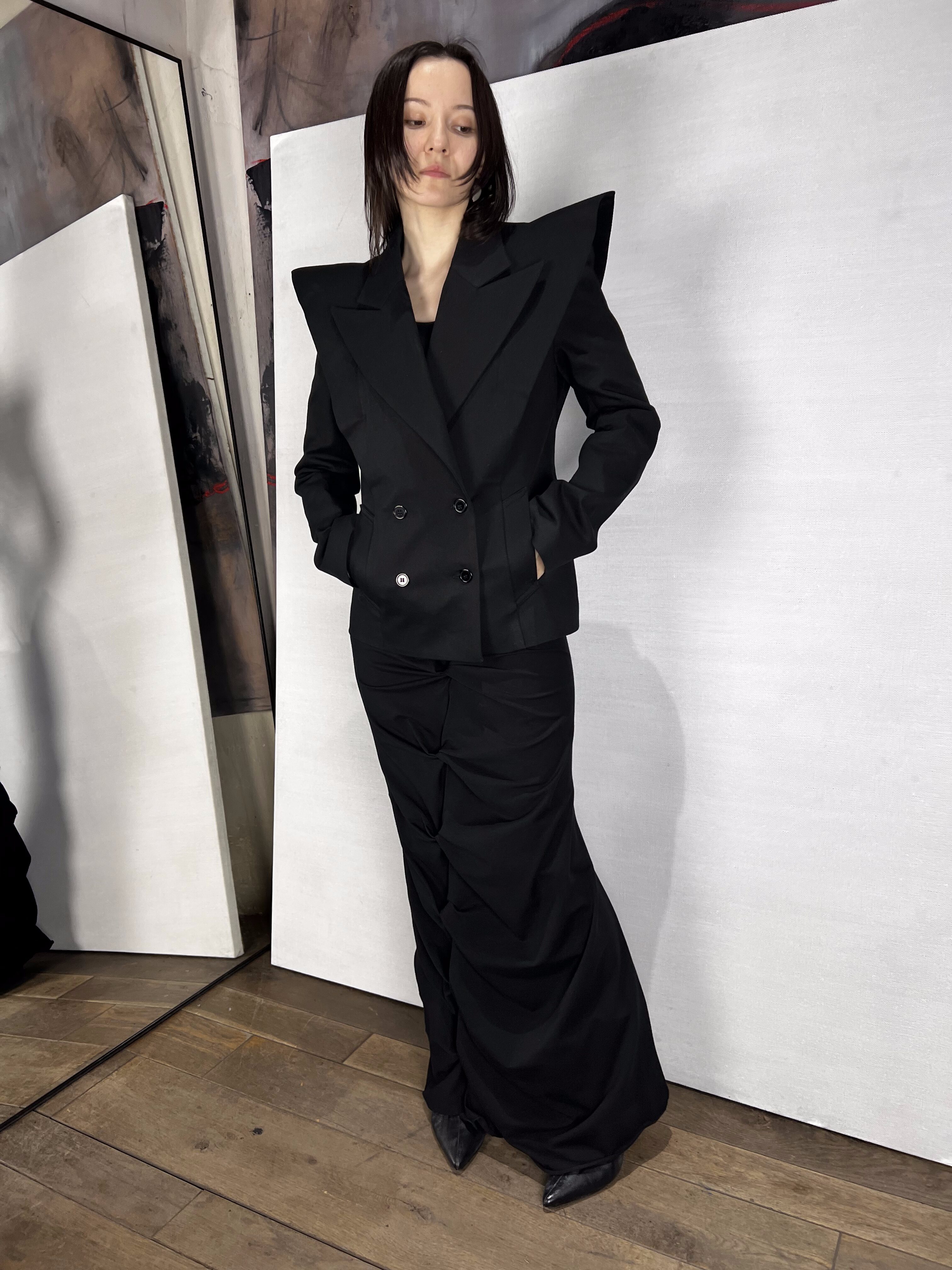 Острое плечо — как точка концентрации. Чёткий жест, в котором собираются характер и форма. Оно задаёт направление, выстраивает силуэт, делает образ собранным и точным. Чёрный пиджак с острым плечом Посадка по фигуре делает его продолжением тела — естественным, уверенным, вне времени.