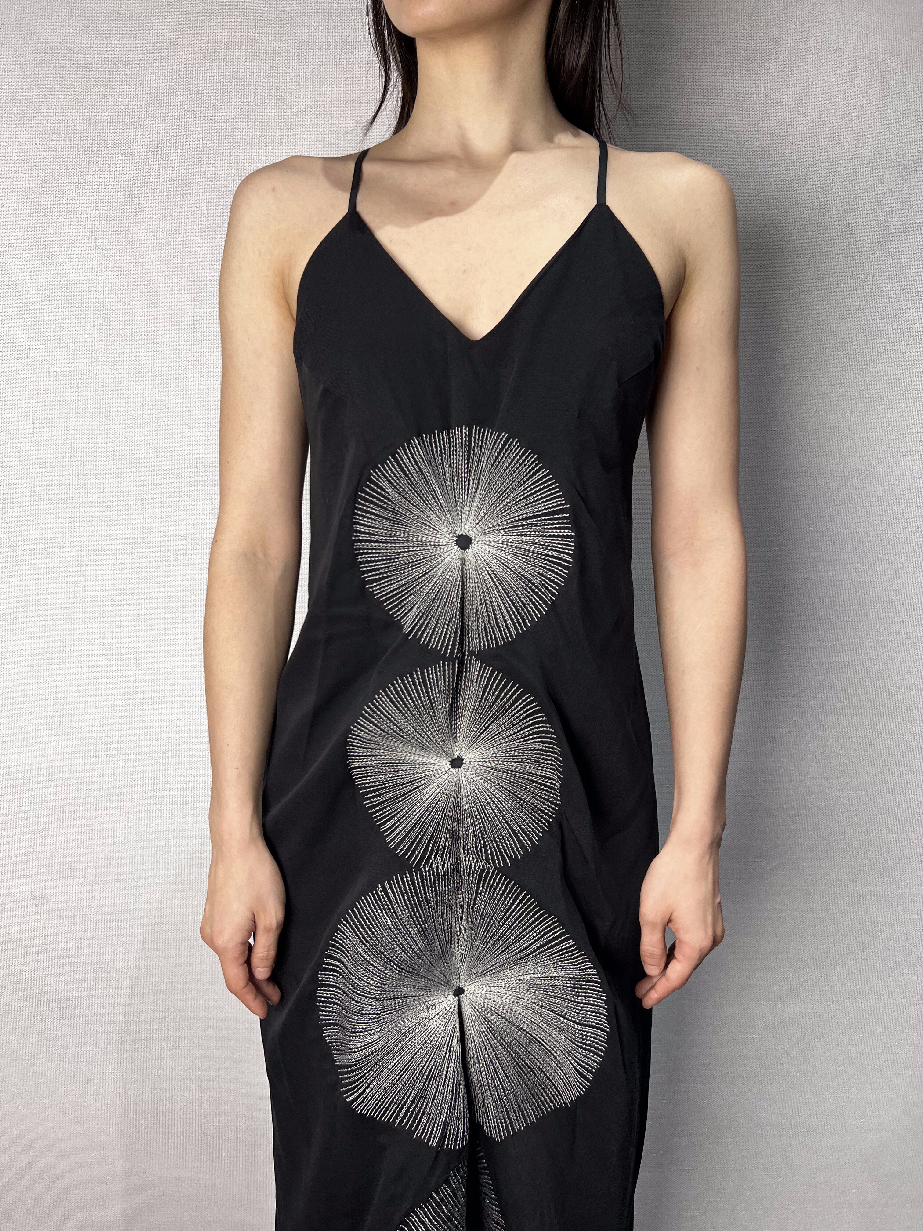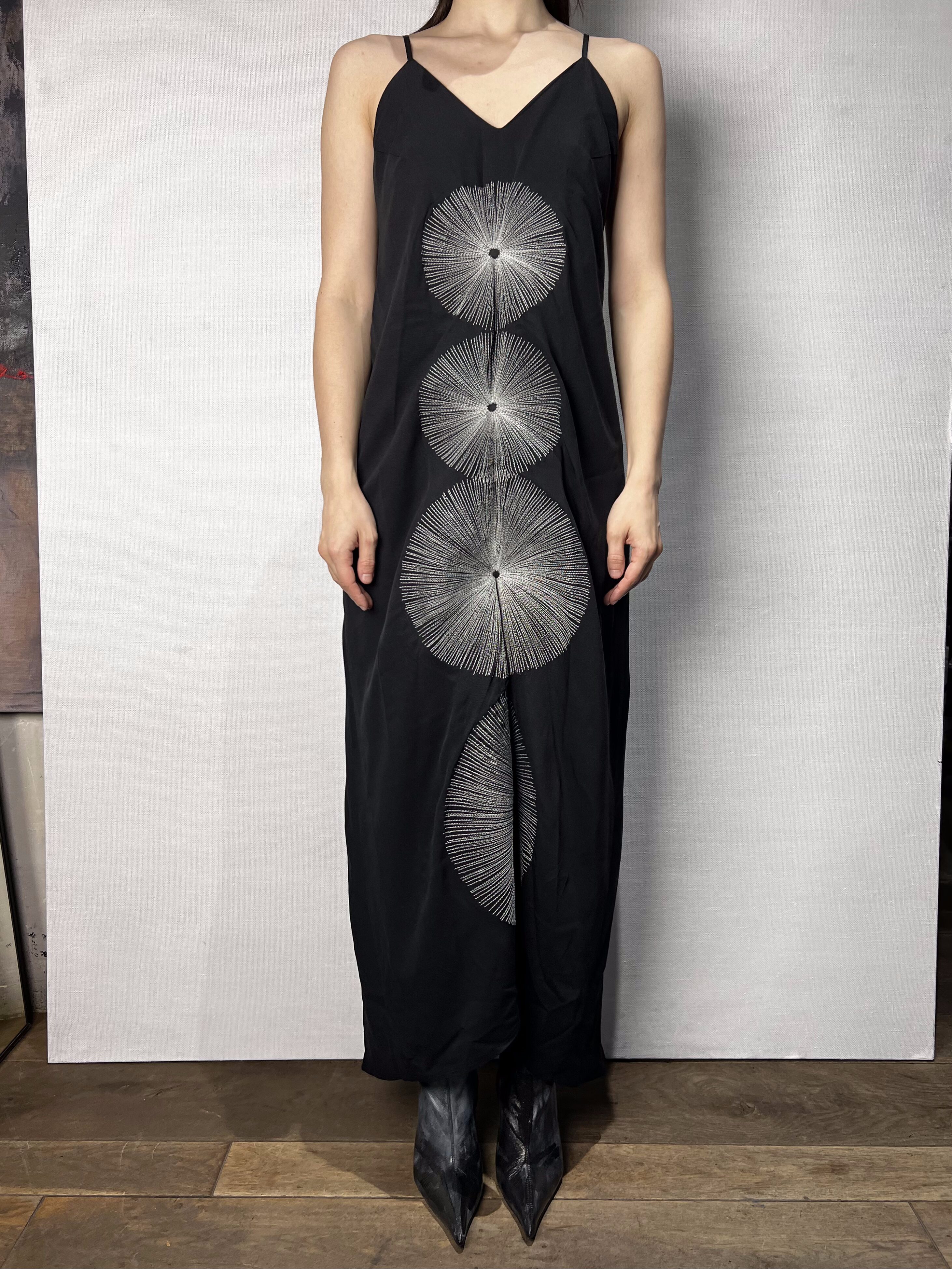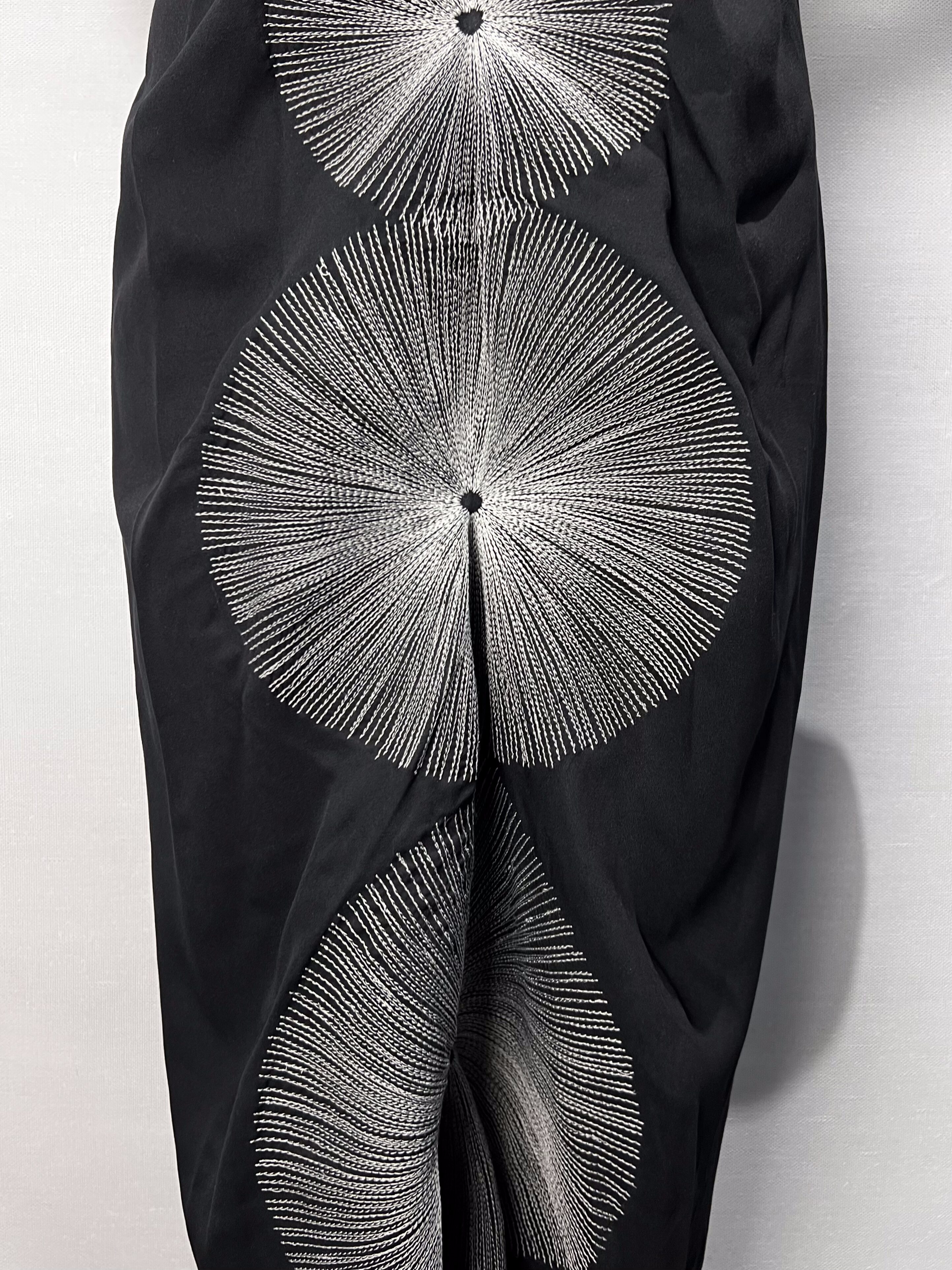 Вертикально по центру — вышивка из четырех кругов, расходящихся как лучи. Она выстроена по оси тела и делит силуэт на зоны, создавая ощущение внутреннего ритма и баланса. Образ считывается не сразу — он раскрывается в движении.