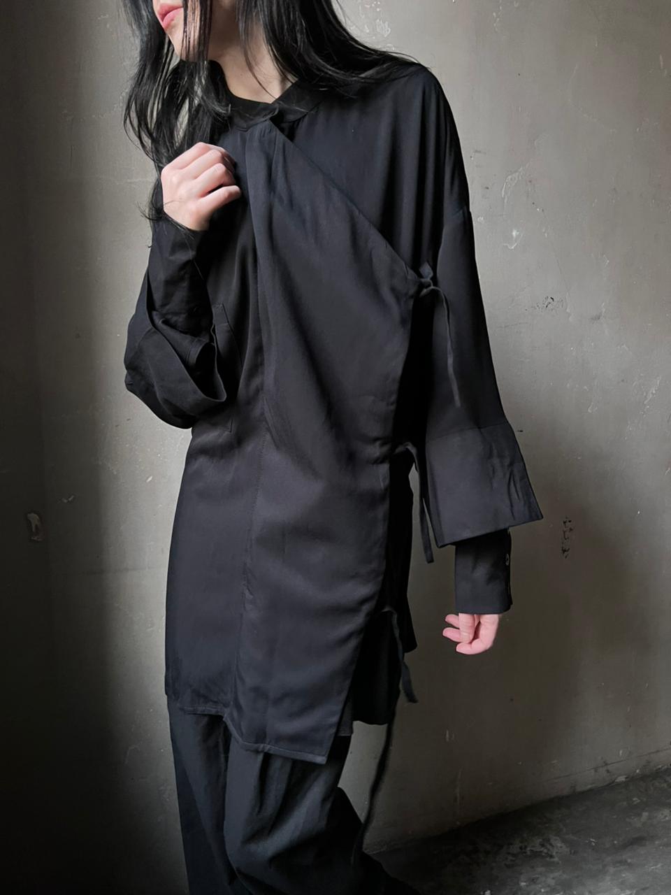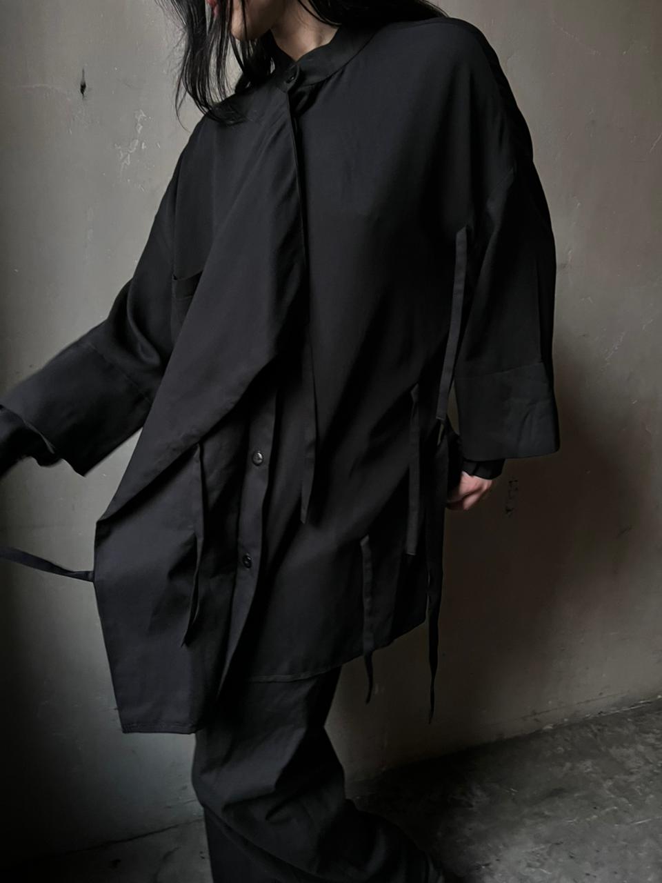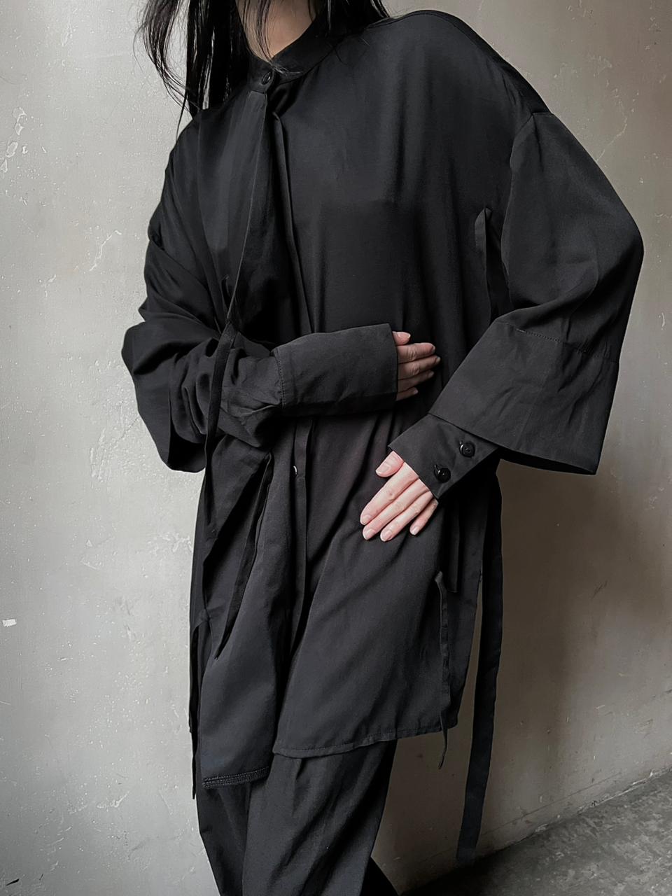 Черная рубашка с двойным рукавом, свободного кроя. Спереди отлетная деталь, которую можно фиксировать на завязки.