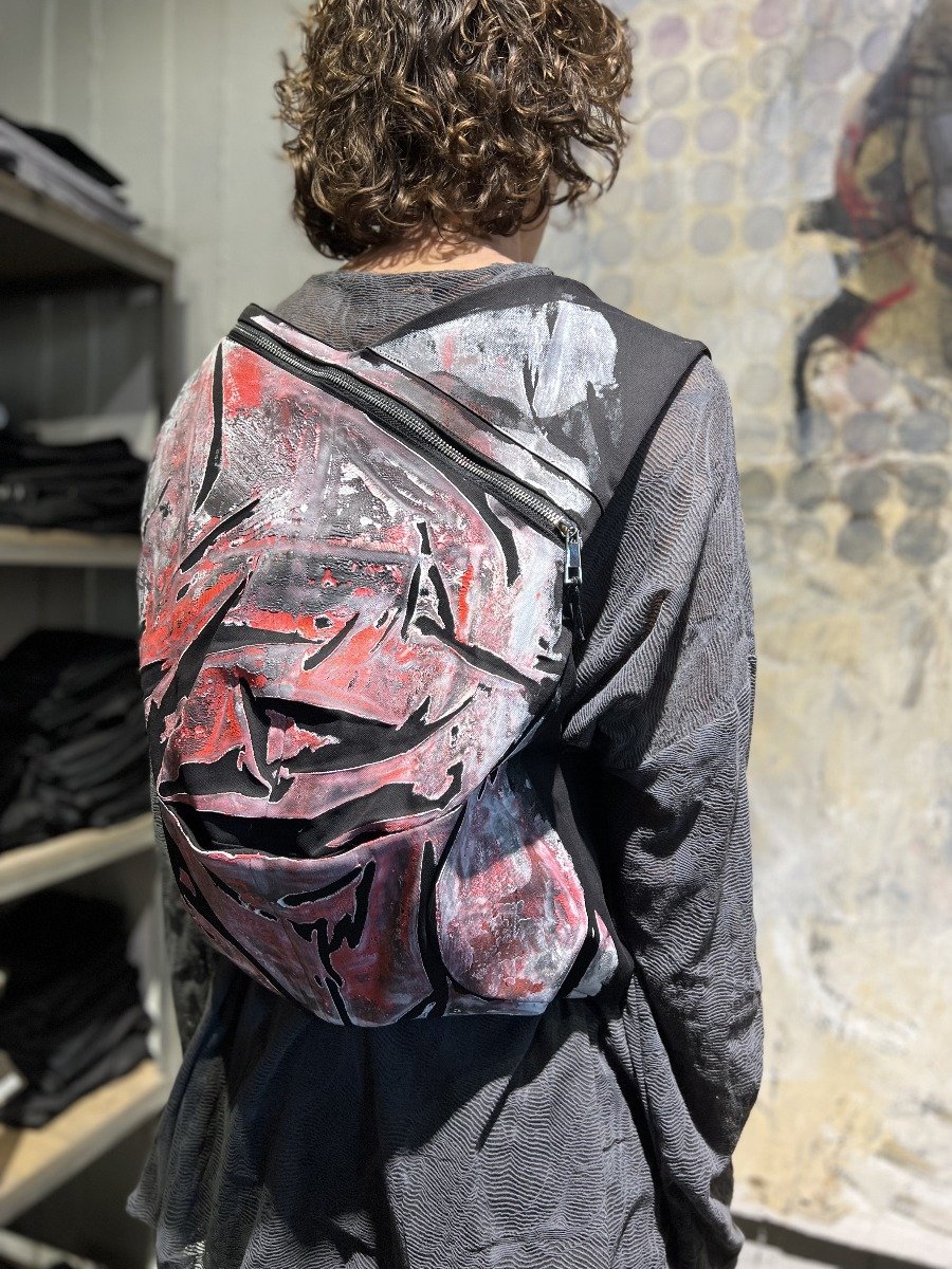 Рюкзак выполнен из плотной, хлопковой ткани, имеет эргономичную форму, одновременно является и одеждой и сумкой. Рисунок кроя и принт напоминает панцирь черепахи. В него помещается компьютер, планшет и любимые вещи