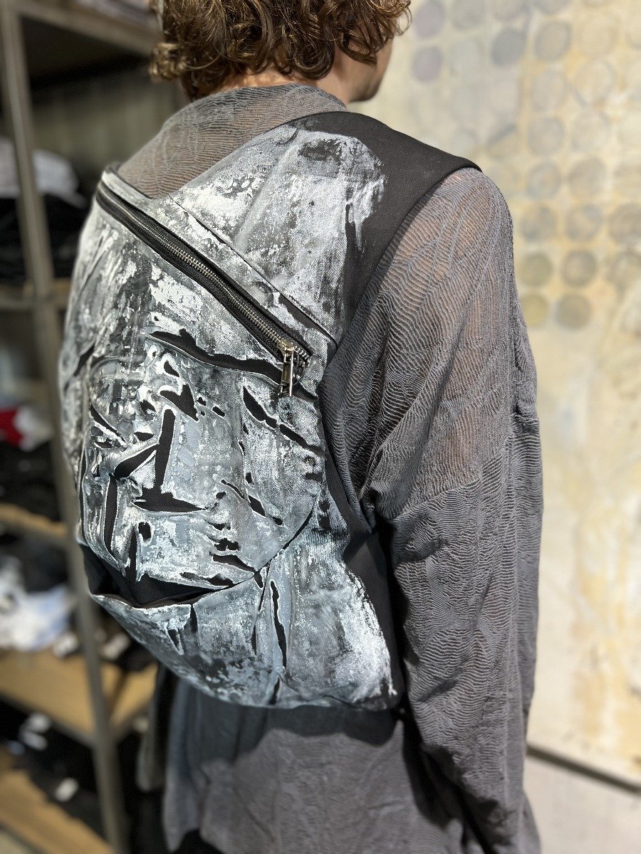 Рюкзак выполнен из плотной, хлопковой ткани, имеет эргономичную форму, одновременно является и одеждой и сумкой. Рисунок кроя и принт напоминает панцирь черепахи. В него помещается компьютер, планшет и любимые вещи.