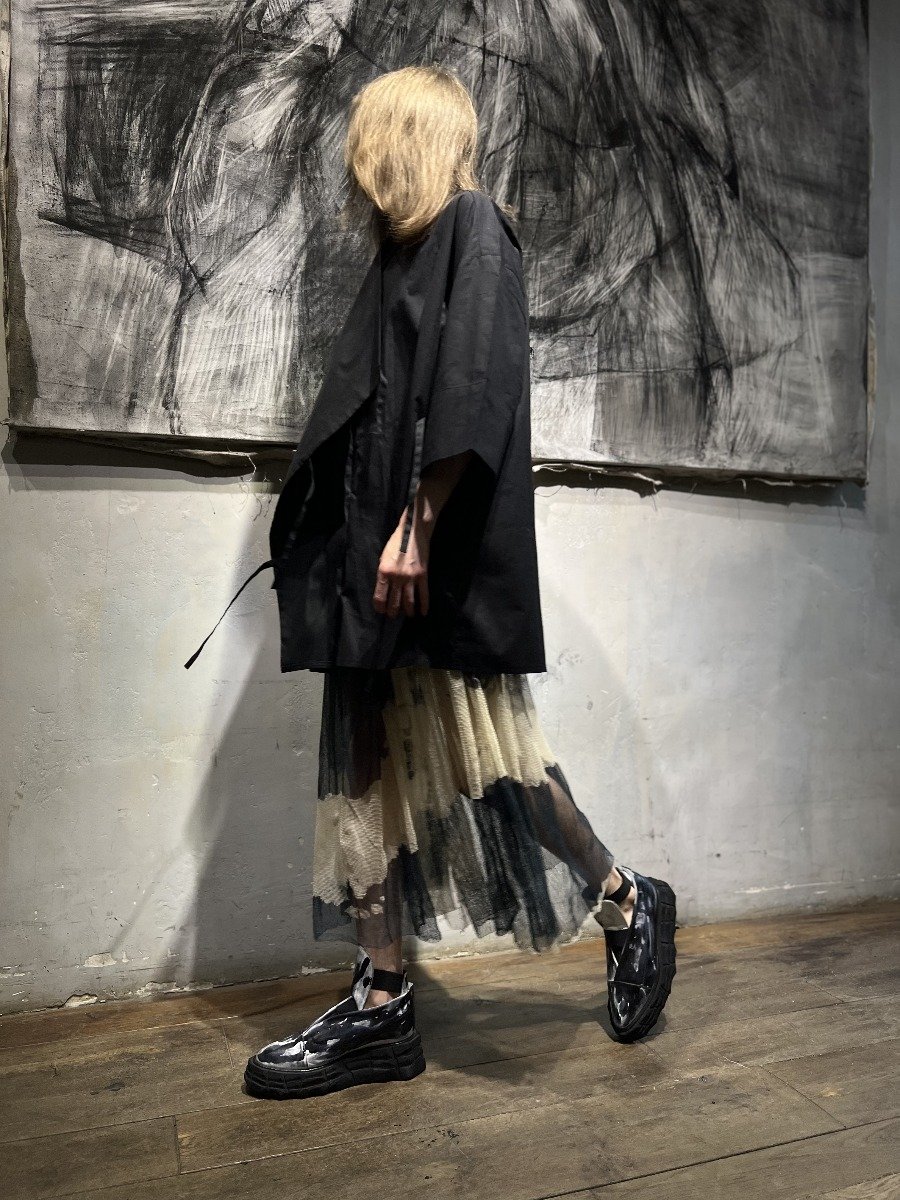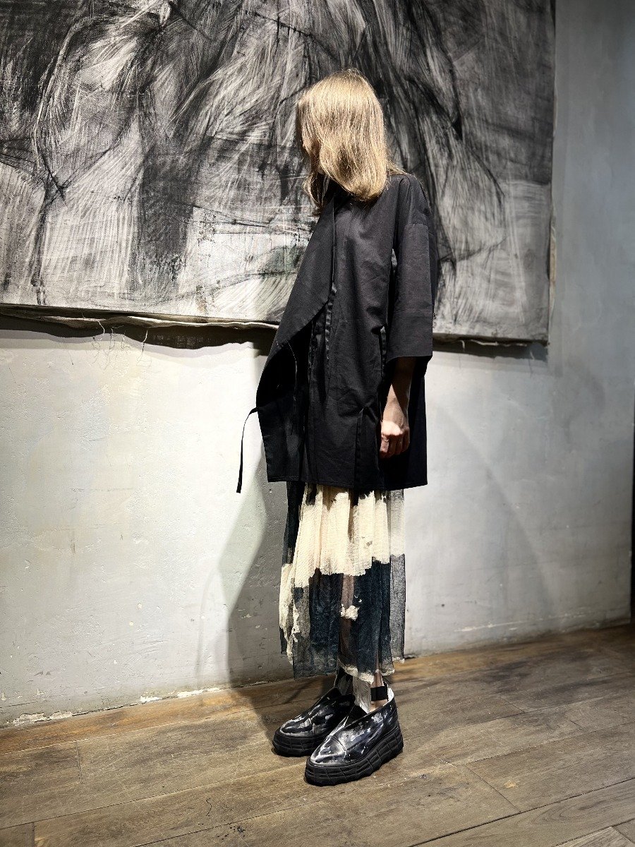 Выполнена из легкой, полупрозрачной ткани, что придает ей воздушность и легкость. Структурированный крой с асимметричными элементами и свободными завязками создает эффект непринужденной элегантности, идеально подходящий для уверенной в себе женщины, которая ценит уникальность и стиль. Высокий воротник-стойка добавляет нотку строгости и утонченности, в то время как свободные рукава и небрежные детали придают образу динамичность и современность.