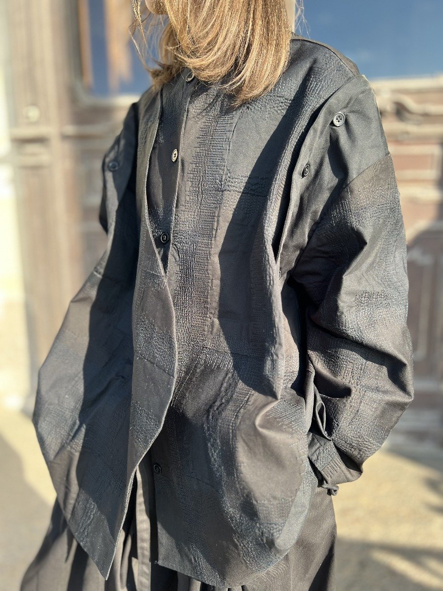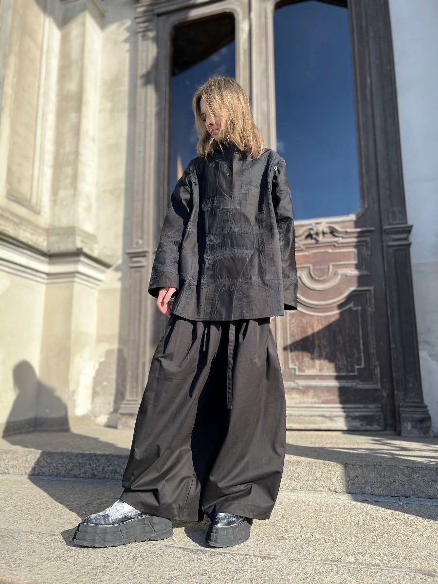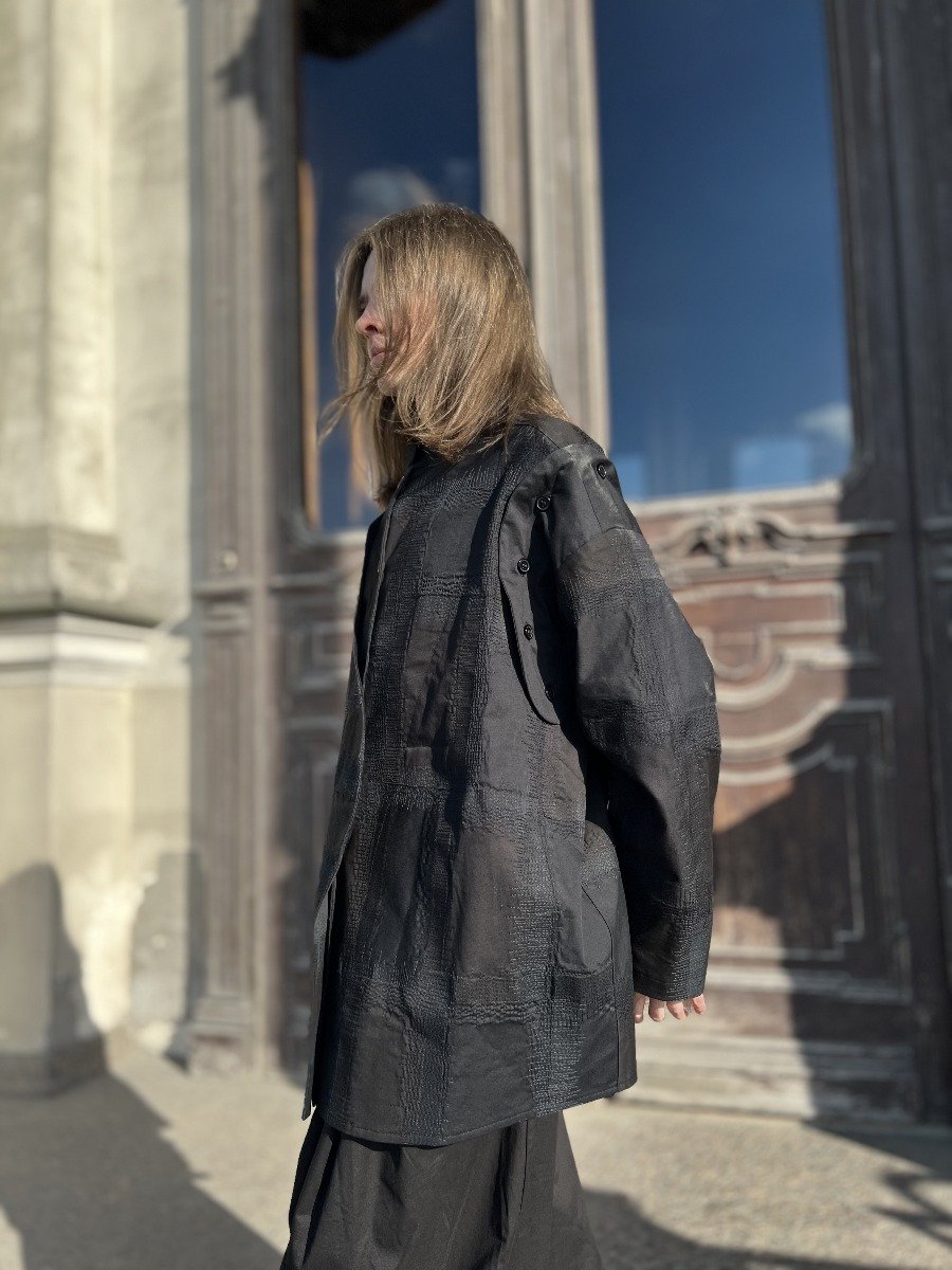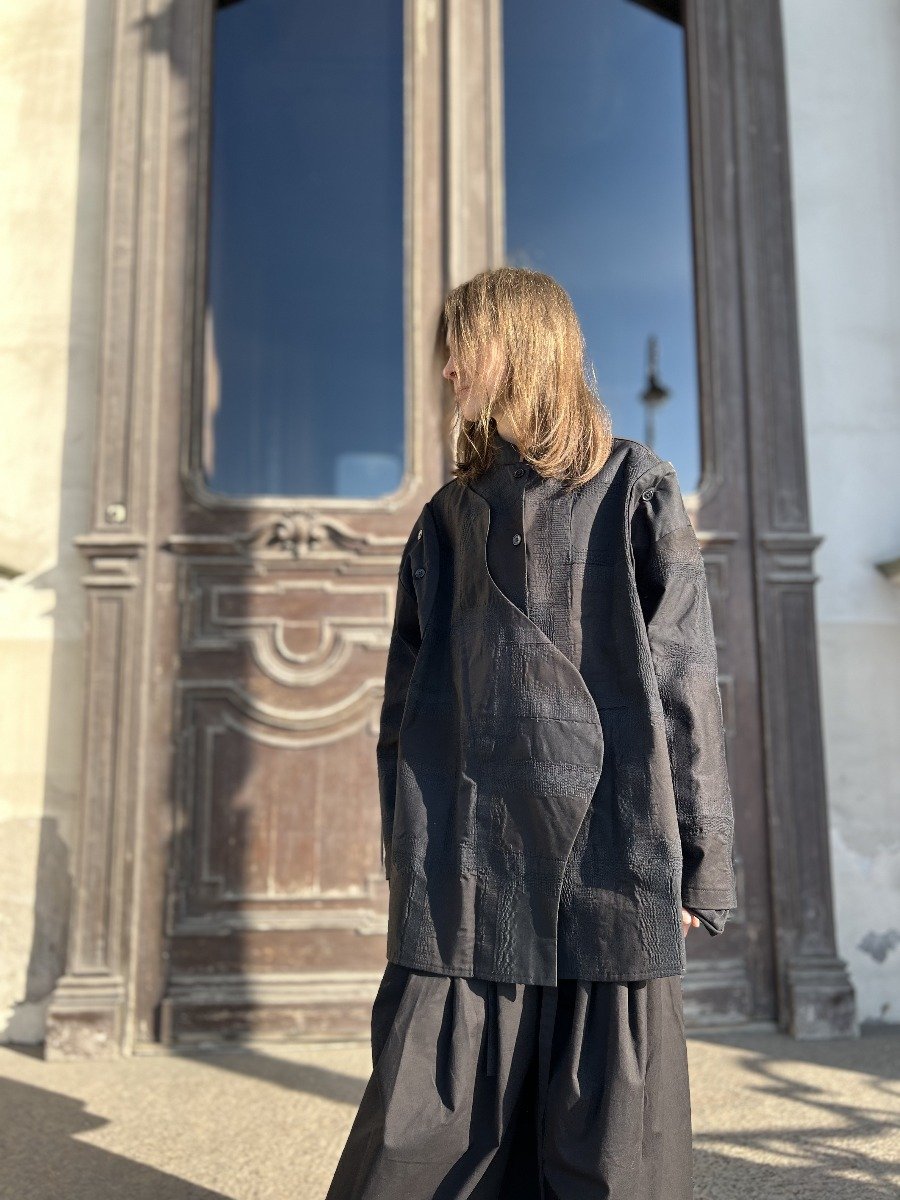 Рубашка воплощает в себе концепцию разумного потребления и апсайкла. Изделие выполнено из кусочков ткани, что придает ему уникальный и неповторимый вид. Вышивка, выполненная вручную, добавляет рубашке элегантности и подчеркивает её индивидуальность. Модель отличается свободным кроем и глубоким черным цветом, что делает её универсальной и подходящей для любого гардероба. Использование переработанных материалов свидетельствует о заботе бренда о природе и стремлении к устойчивой моде. Эта рубашка станет отличным выбором для тех, кто ценит стиль, качество и экологическую ответственность.