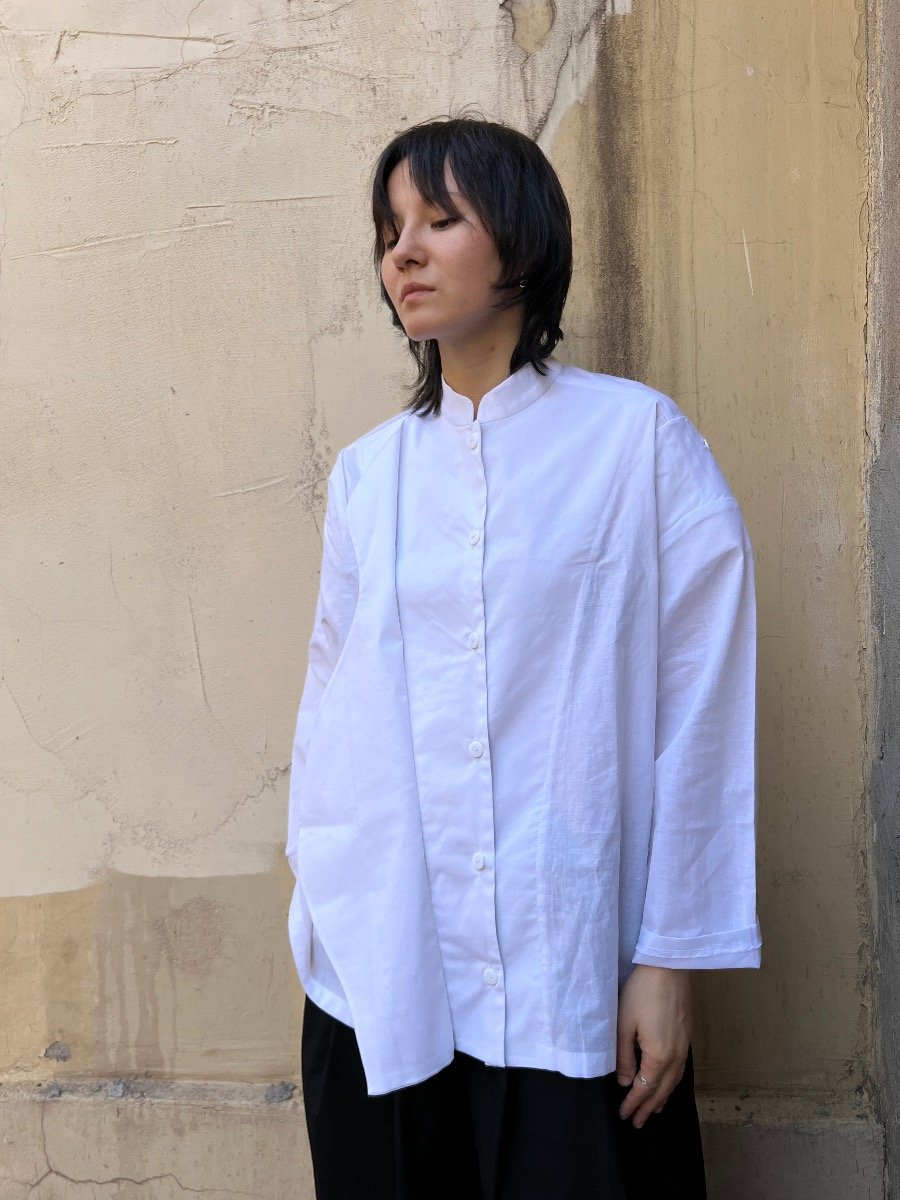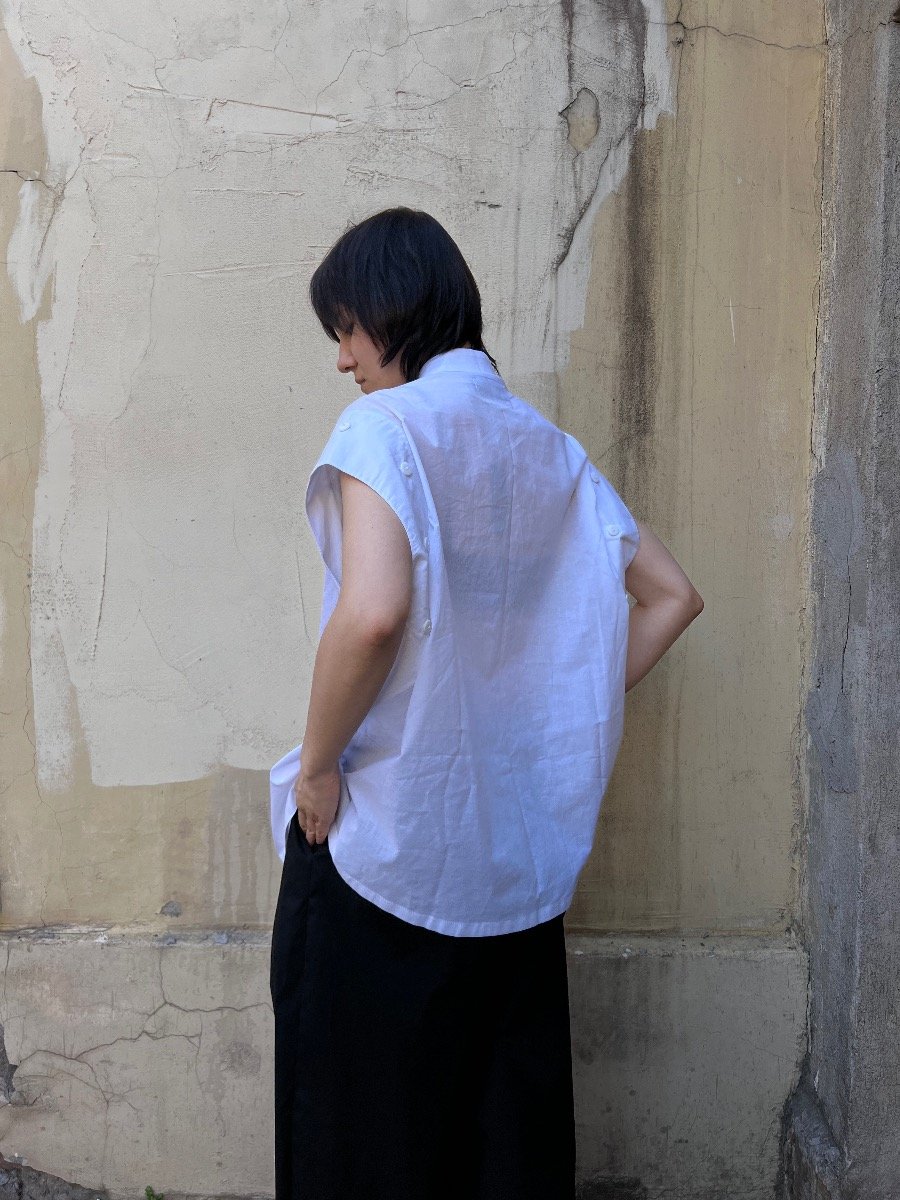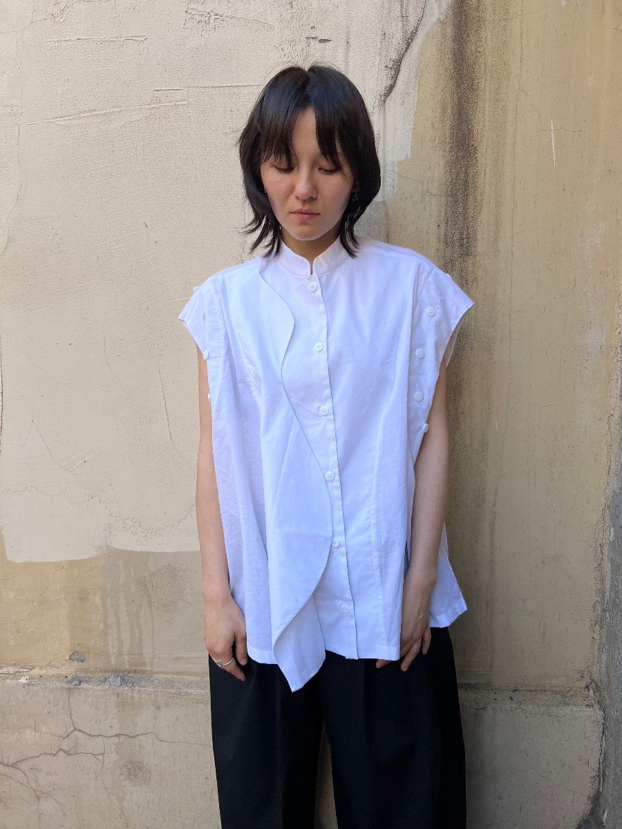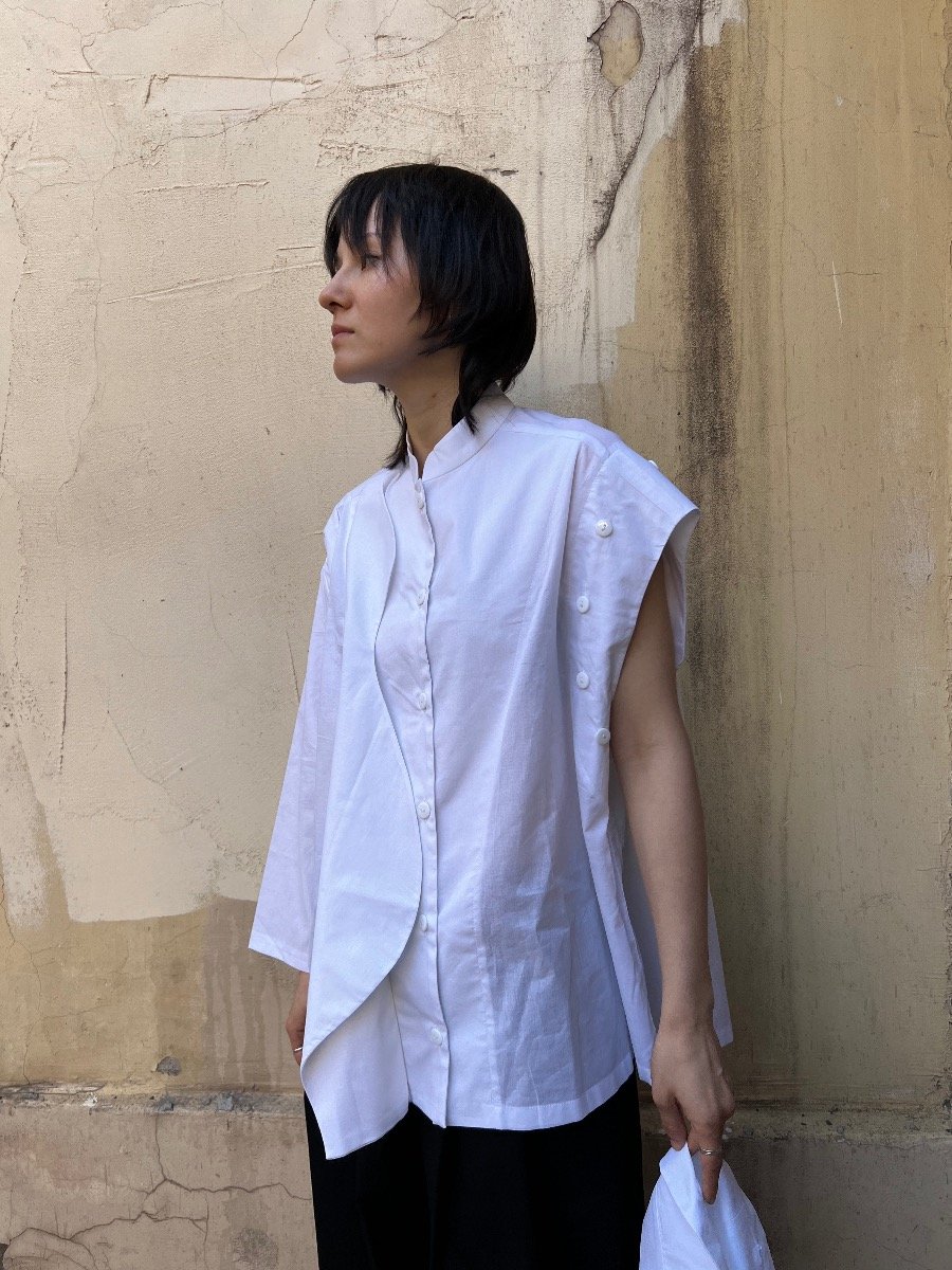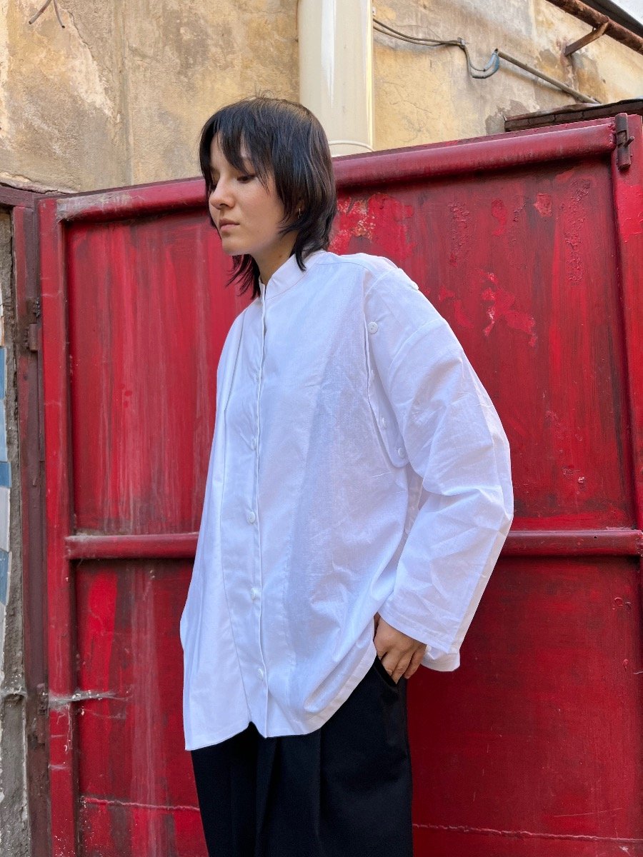 Белая оверсайз рубашка из мягкого натурального хлопка с отстегивающимися рукавами и декоративной отлетной деталью